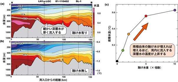 • 図5:気候モデルおよび高解像度の海洋モデルを用いたシミュレーションによって明らかになった融け水とリュツォ・ホルム湾への周極深層水の流入の関係。 リュツォ・ホルム湾における水温分布の断面図。約9000年前の地球環境を再現し、そこに南極氷床由来の融け水を考慮した結果(a)、リュツォ・ホルム湾に融け水なしに比べて(b)、暖かい深層水が厚く流入することが明らかになった。さらに、融け水を増やすほど、流入する深層水の水温が上昇する傾向を示しており(c)、氷床融解による融け水供給と深層水流入の間にフィードバック効果が存在することが示された。