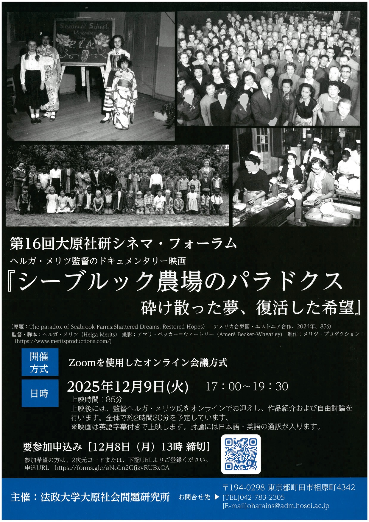 法政大学大原社会問題研究所は、12月9日(火)にオンライン開催で第16回大原社研シネマ・フォーラム『シーブルック農場のパラドクス 砕け散った夢、復活した希望』(原題:The Paradox of Seabrook Farms: Shattered Dreams. Restored Hopes)を開催します(参加費無料、事前申込制)。上映後に、監督による作品紹介および自由討論も行われます。
