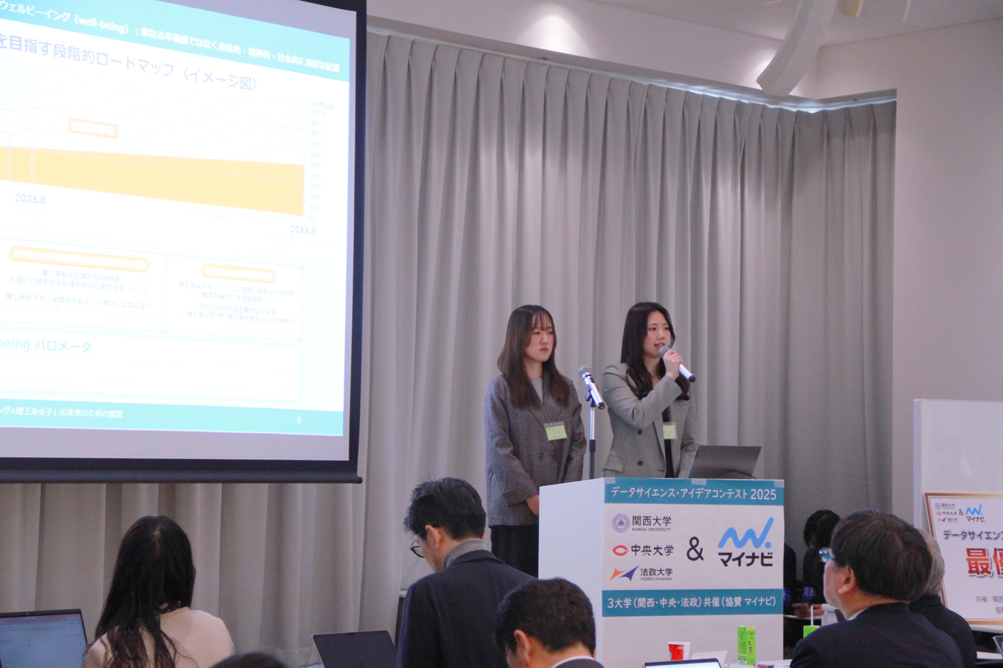 2025年11月22日(土)、法政大学(総長: Diana Khor)、関西大学(学長:高橋智幸)、中央大学(学長:河合久)の3大学は、株式会社マイナビ(代表取締役 社長執行役員:土屋芳明、以下 マイナビ)の協賛により、関西大学梅田キャンパスにて「3大学共催データサイエンス・アイデアコンテスト2025(協賛マイナビ)」の最終選考会を開催しました。