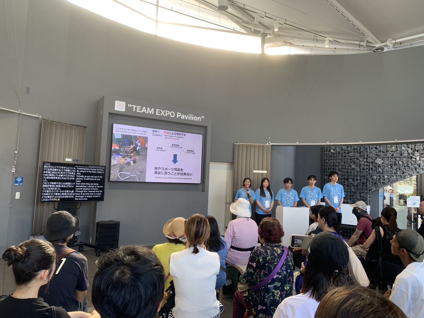 また、「TEAM EXPOパビリオン」内で関西大学が主催した「関大万博 TEP 貸切 Day」にも参加しました。こちらは、関西大学の学生等がこれまで取り組んできた共創チャレンジの成果を発表・展示するイベントです。加えて、昨年度の「KANDAI×HOSEI SDGsアクションプランコンテスト2024」にて、大阪・関西万博賞を受賞した法政大学現代福祉学部佐野ゼミ×スポーツ健康学部吉田ゼミも、取り組みについて発表・展示を行いました。今回のプログラムの参加者にとっても、同世代が描く未来社会への挑戦に触れ、大いに刺激を受ける場となりました。