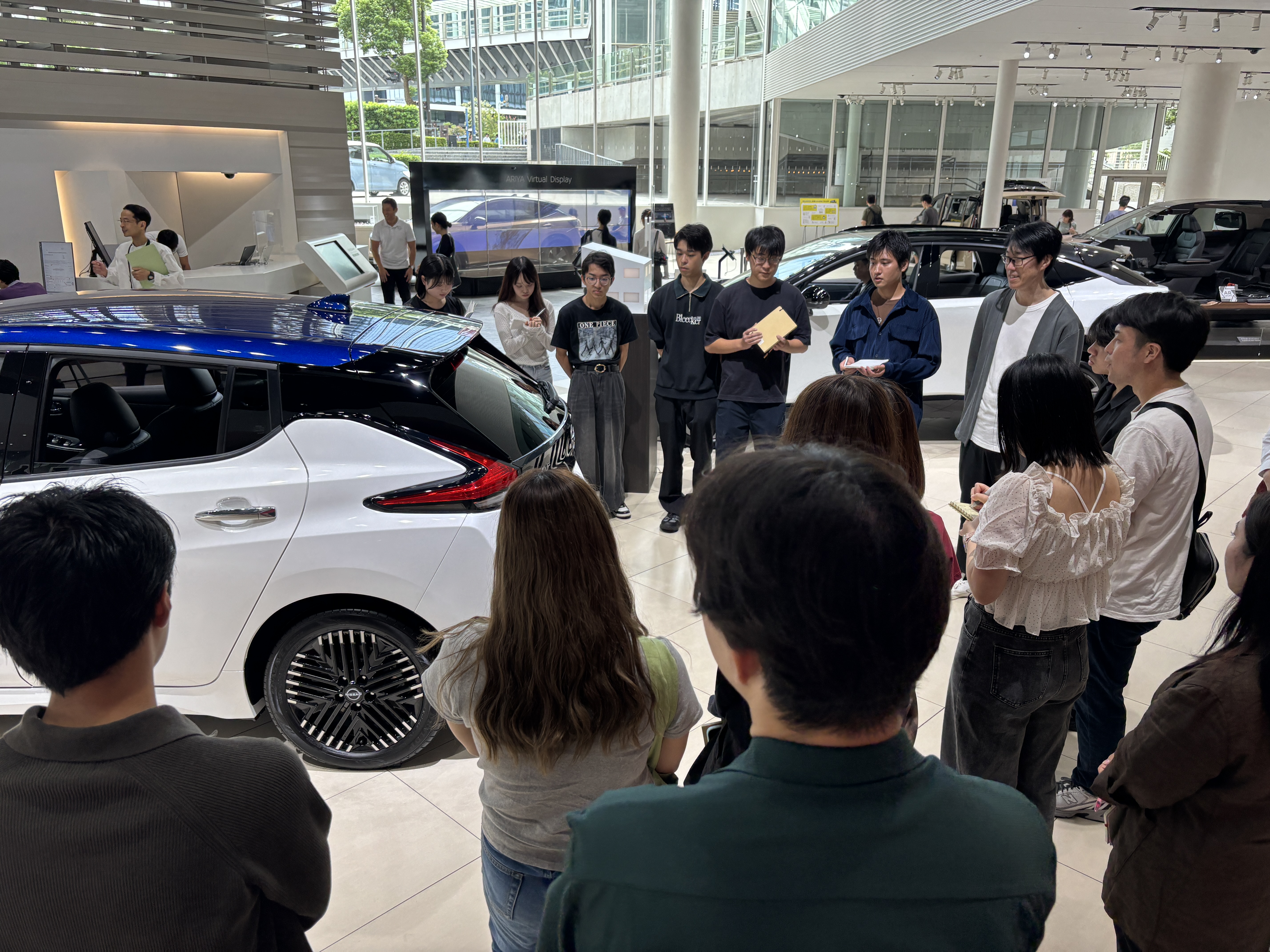 まずはじめに、「GREEN JOURNEY」の取り組みにも参画する日産自動車株式会社様より、同社の取り組みである「ブルースイッチ」について講義いただきました。また、その後は、日産グローバルギャラリーにて実際に自動車を見学しました。これらを通じて、EVの現状やEVを通じて取り組む脱炭素化や災害対策に関する取り組みを学びました。