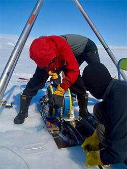 熱水ジェットをホースで送り込みながら棚氷を掘り進む