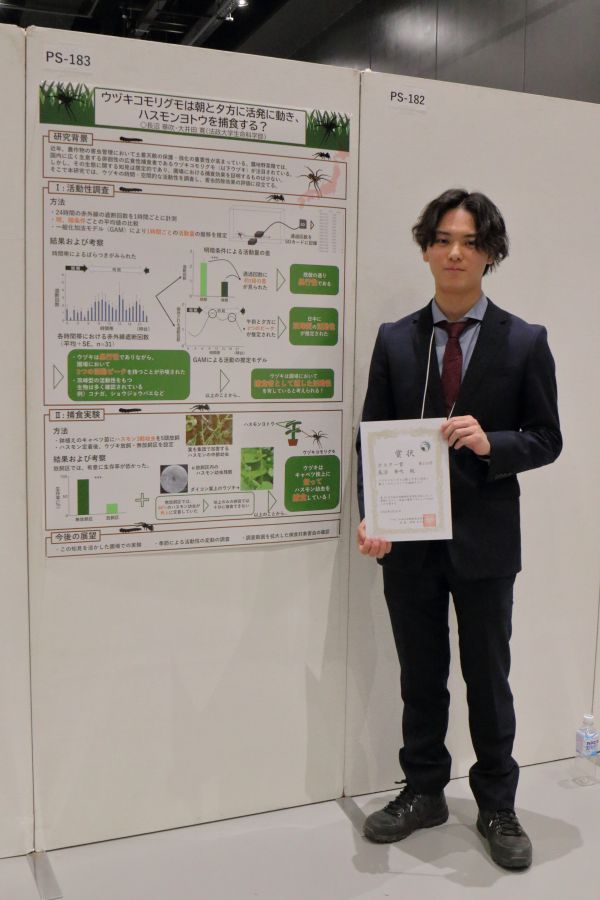 受賞したポスターのタイトルは「ウヅキコモリグモは朝と夕方に活発に動き、ハスモンヨトウを捕食する?」です。
