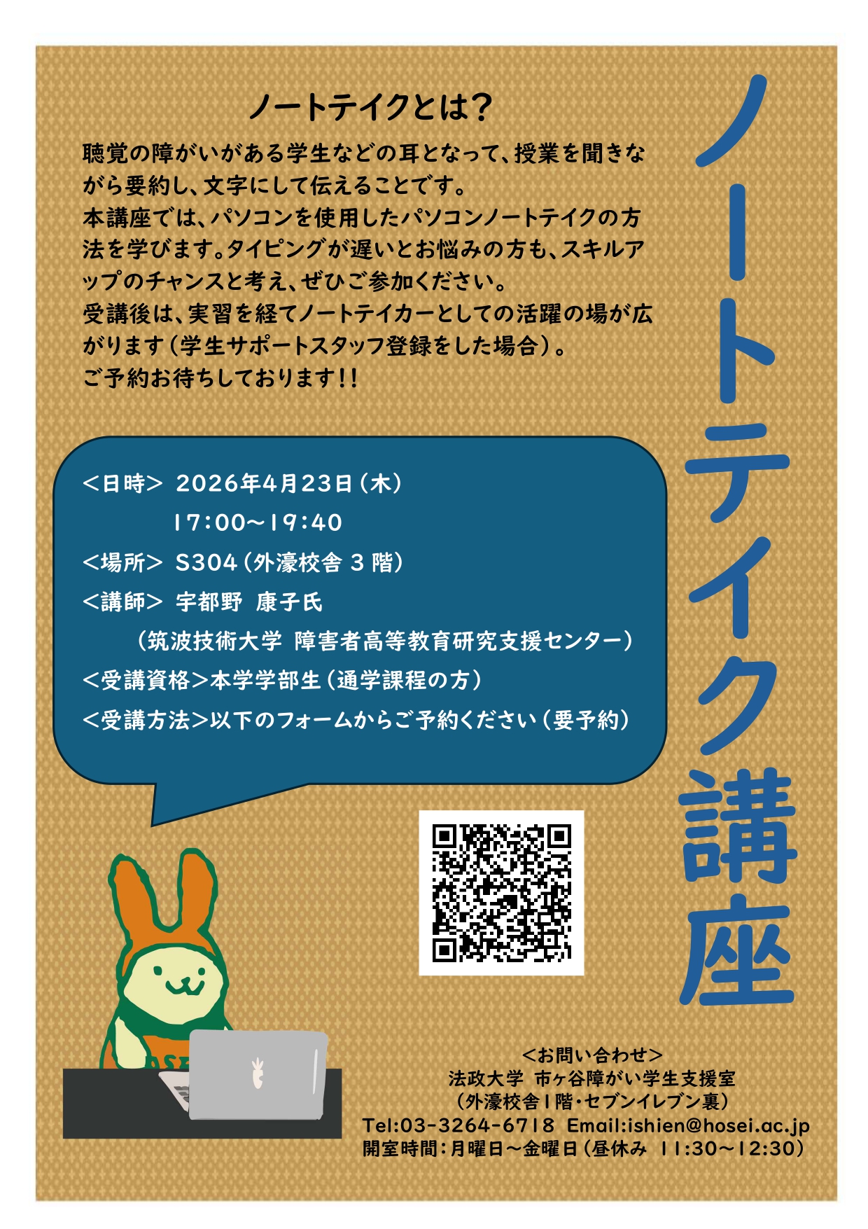 市ヶ谷障がい学生支援室では、「ノートテイク講座」を開催します。
