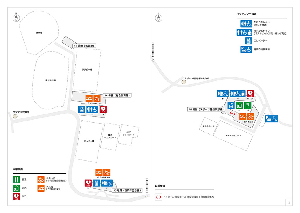 現代福祉学部棟1~3 階(男子用各階1、女子用各階1)、スポーツ健康学部棟2・3階(男女兼用各1)、大教室A 棟1 階(男女兼用1)、大教室B 棟2 階(男女兼用1)、総合棟1 階(男女兼用1)、