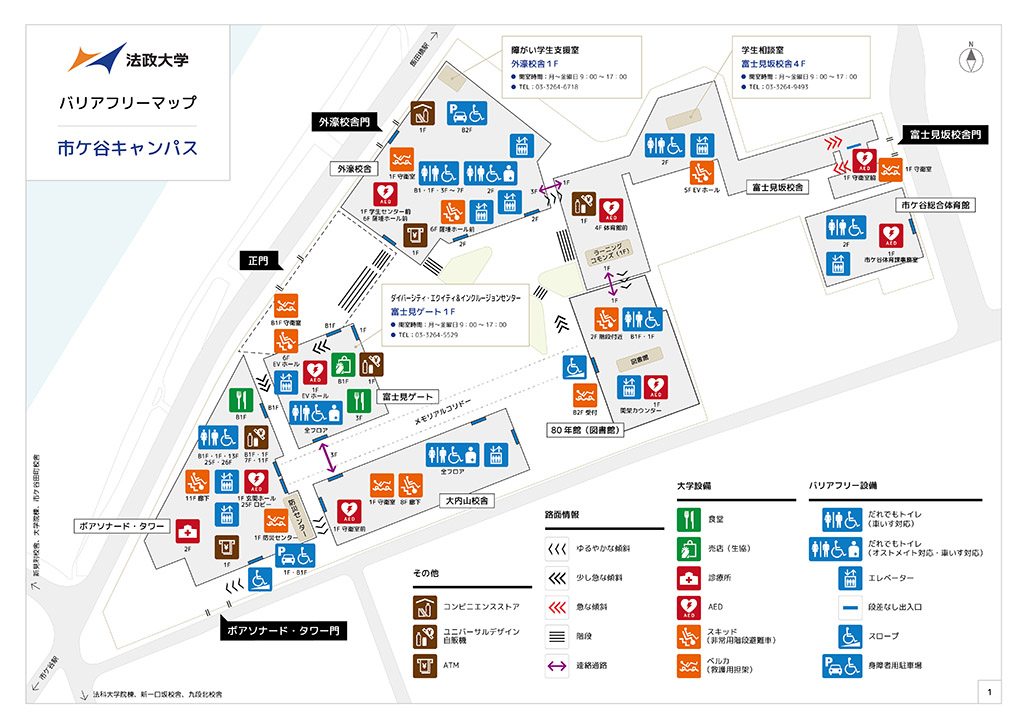 a.だれでもトイレ: BT 地下1・1・13・25・26 階(男女兼用各階1)、富士見坂校舎 2階(男女兼用1)、外濠校舎 地下1~7 階(男女兼用各階1)、図書館 地下1・1 階(男女兼用各階1)、