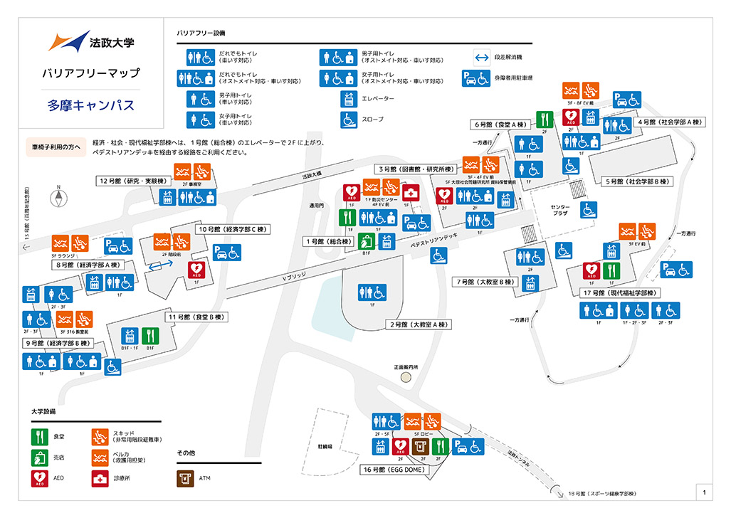 b.視覚障がい者用設備設置エレベーター:経済学部棟、社会学部棟、現代福祉学部棟、スポーツ健康学部棟、大教室B 棟、総合棟、図書館、食堂B 棟、EGG DOME