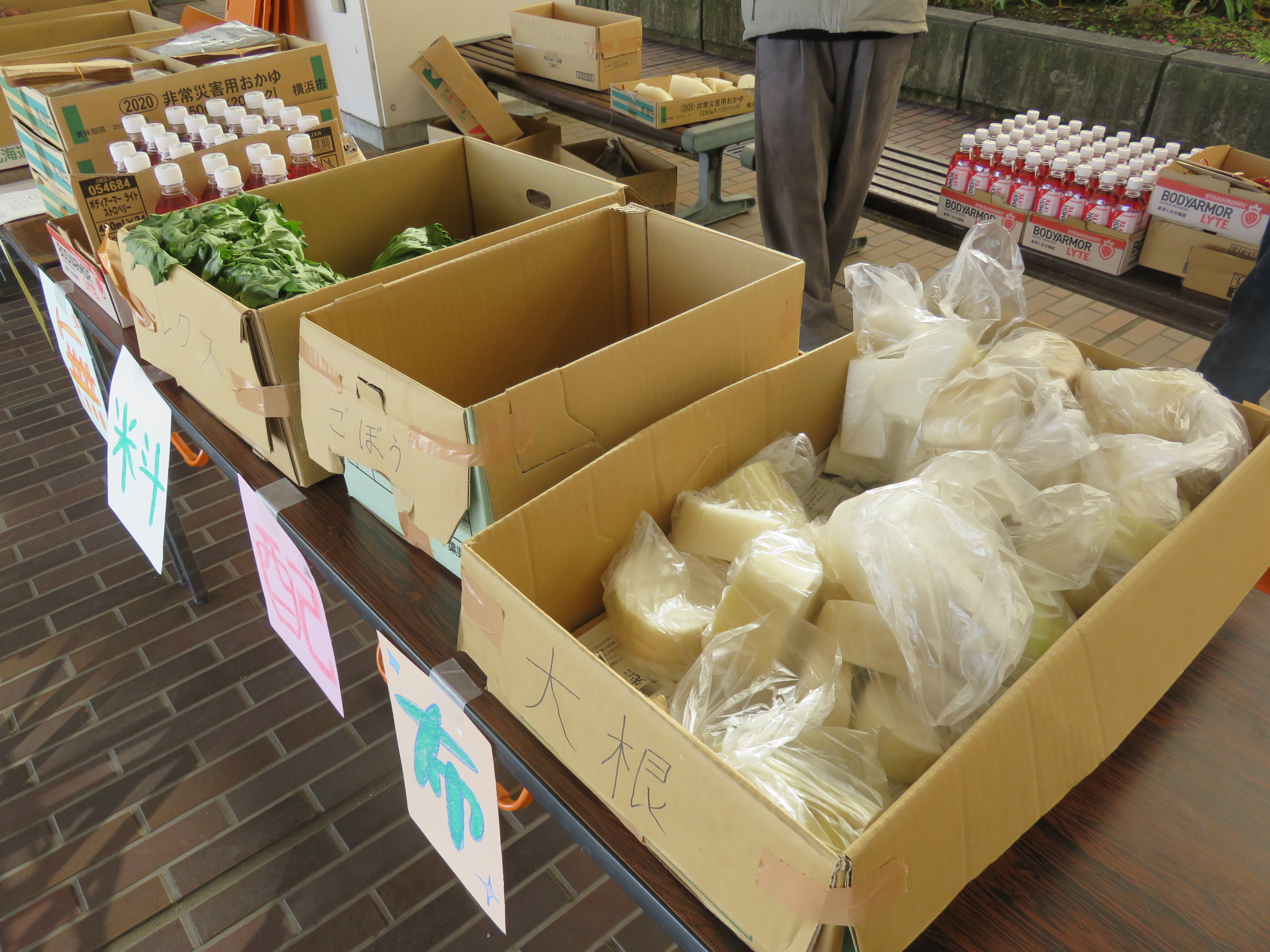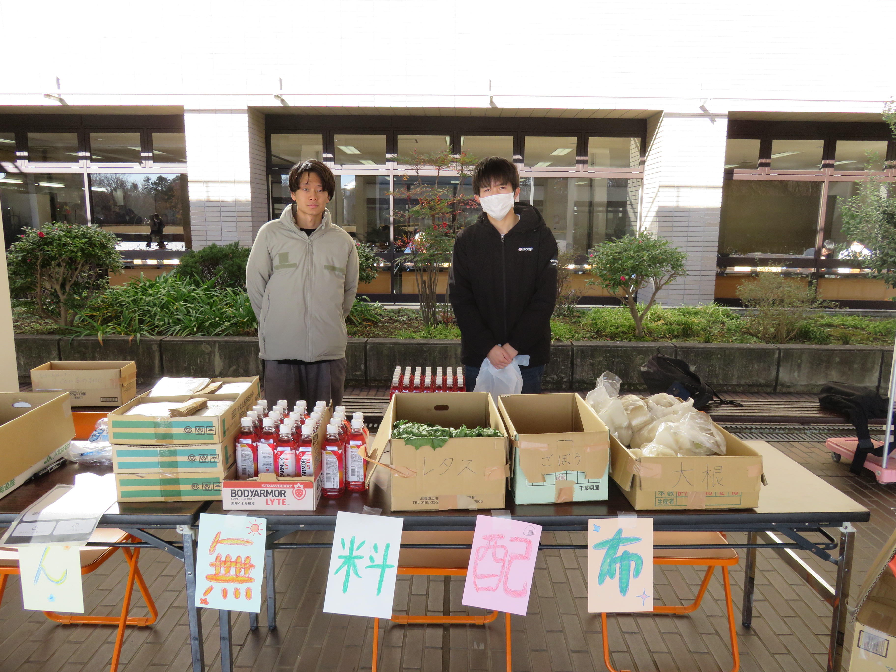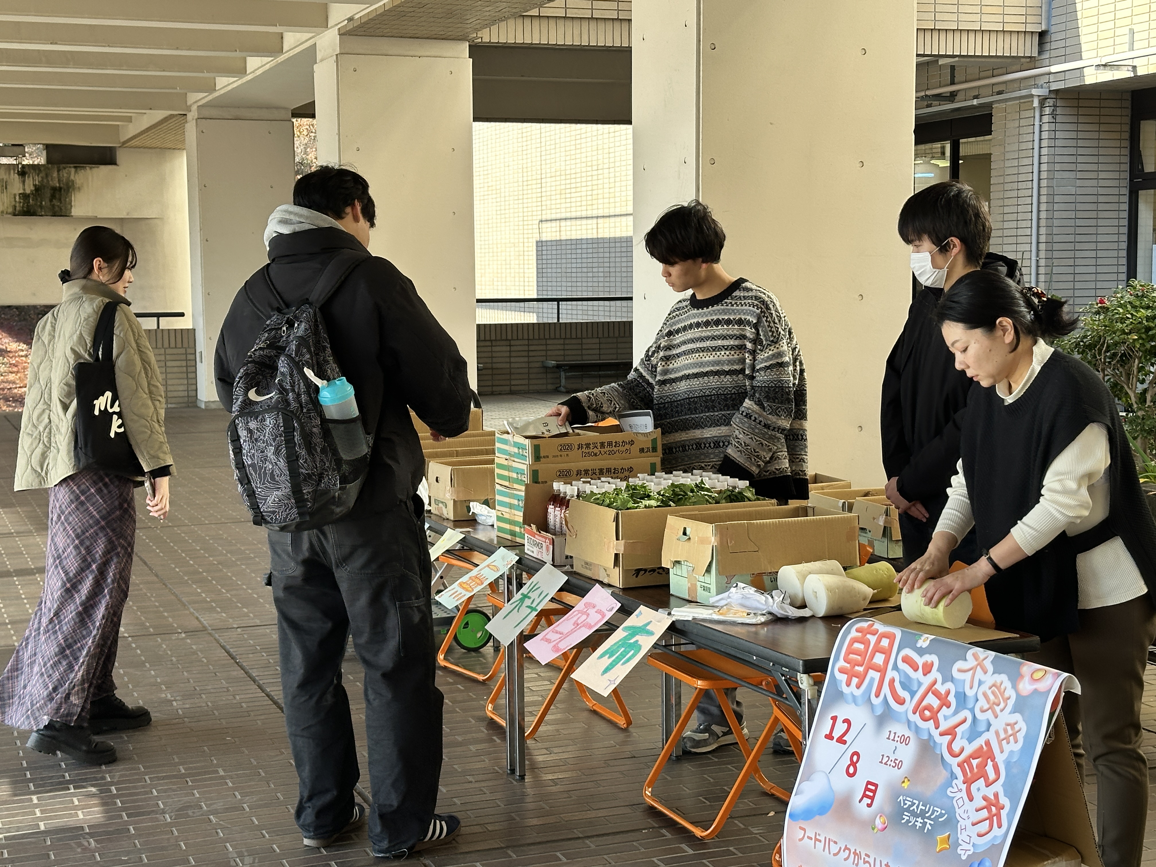 今回のイベントでは、相模原市大学生等未来応援事業、フードバンクかながわ、株式会社相模原大樹農産(大ちゃんの野菜)さんの協力を得て、消費期限間近のパンやおかゆ、また廃棄予定のお野菜などを学生に配布しました。