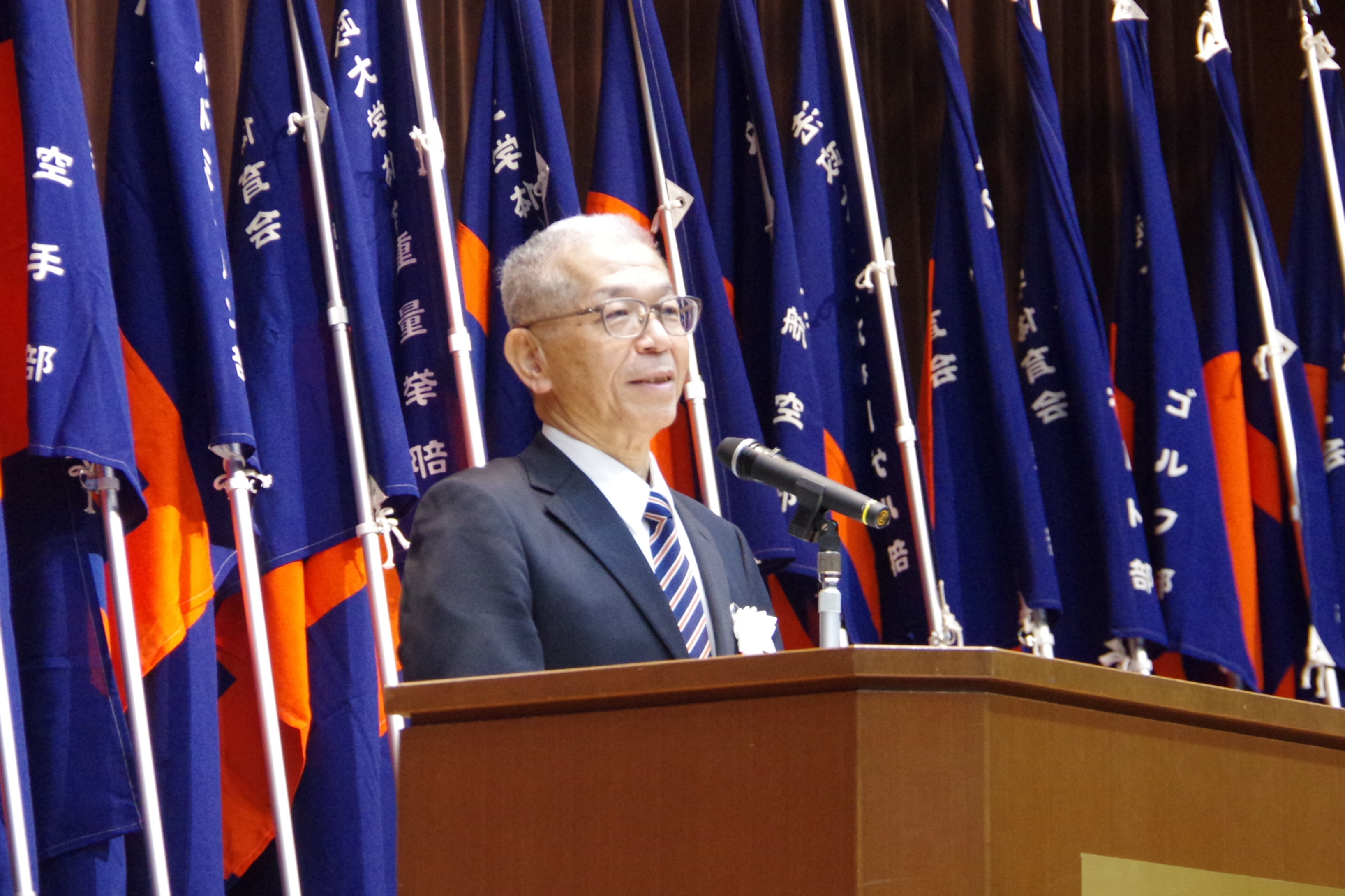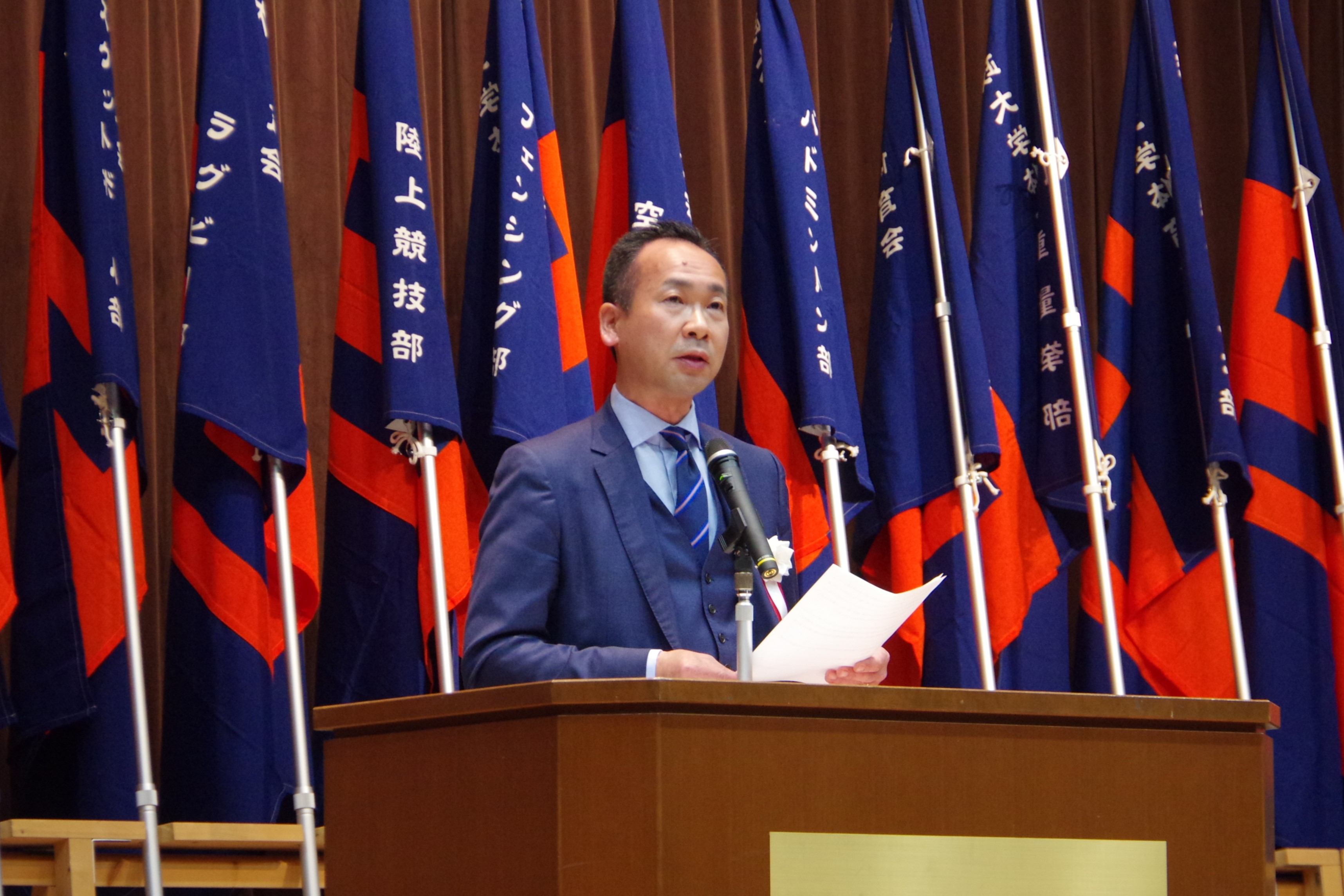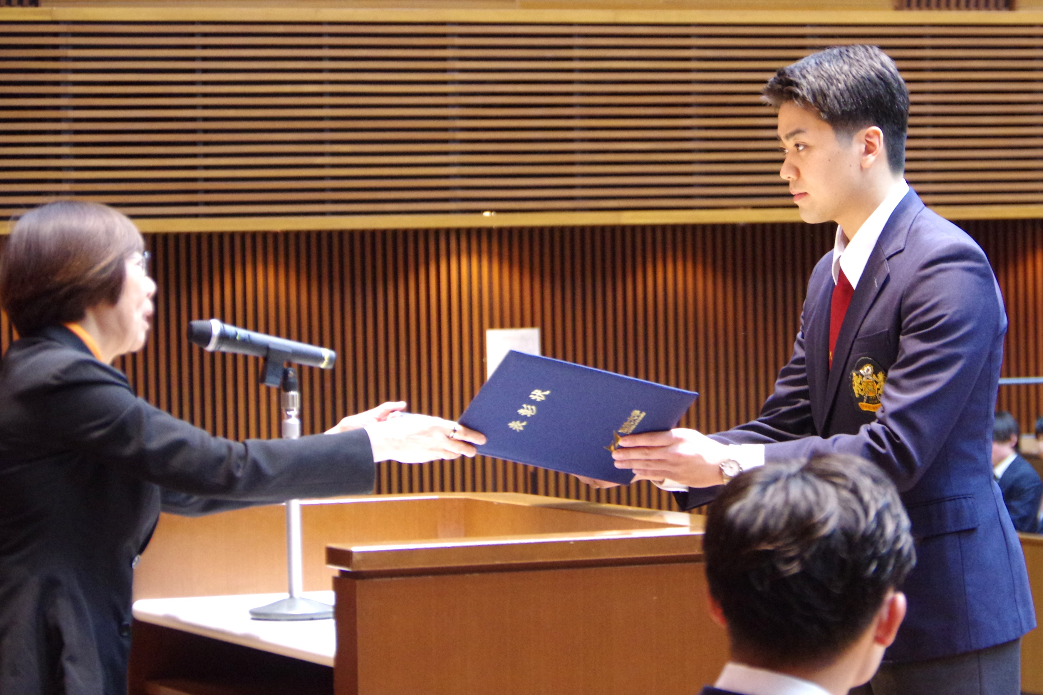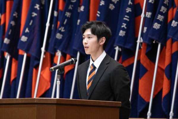 その後、大学表彰・法友体育会表彰の表彰式が執り行われ、卒業生を代表して、クライミングワールドカップ制覇を達成した山岳部の村下善乙さんからお礼の言葉が述べられました。