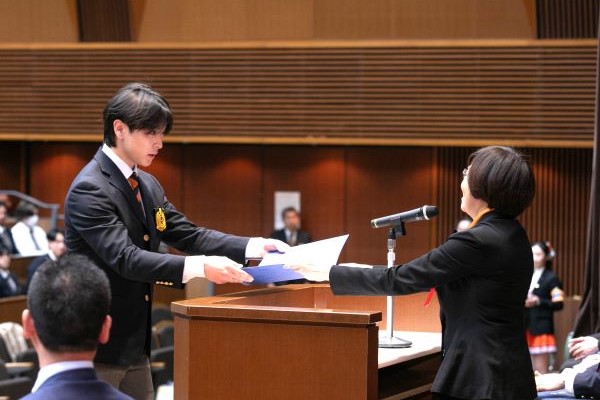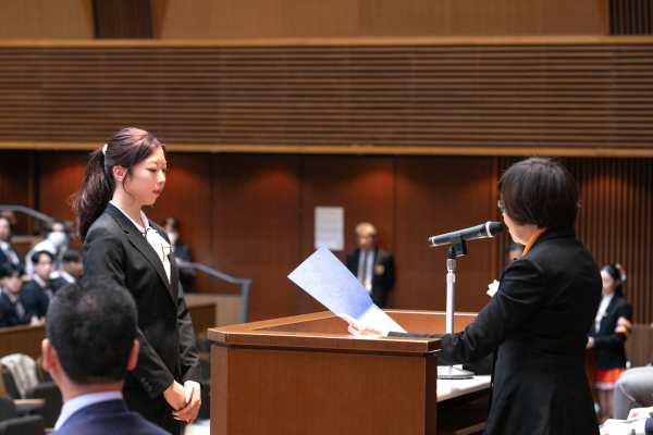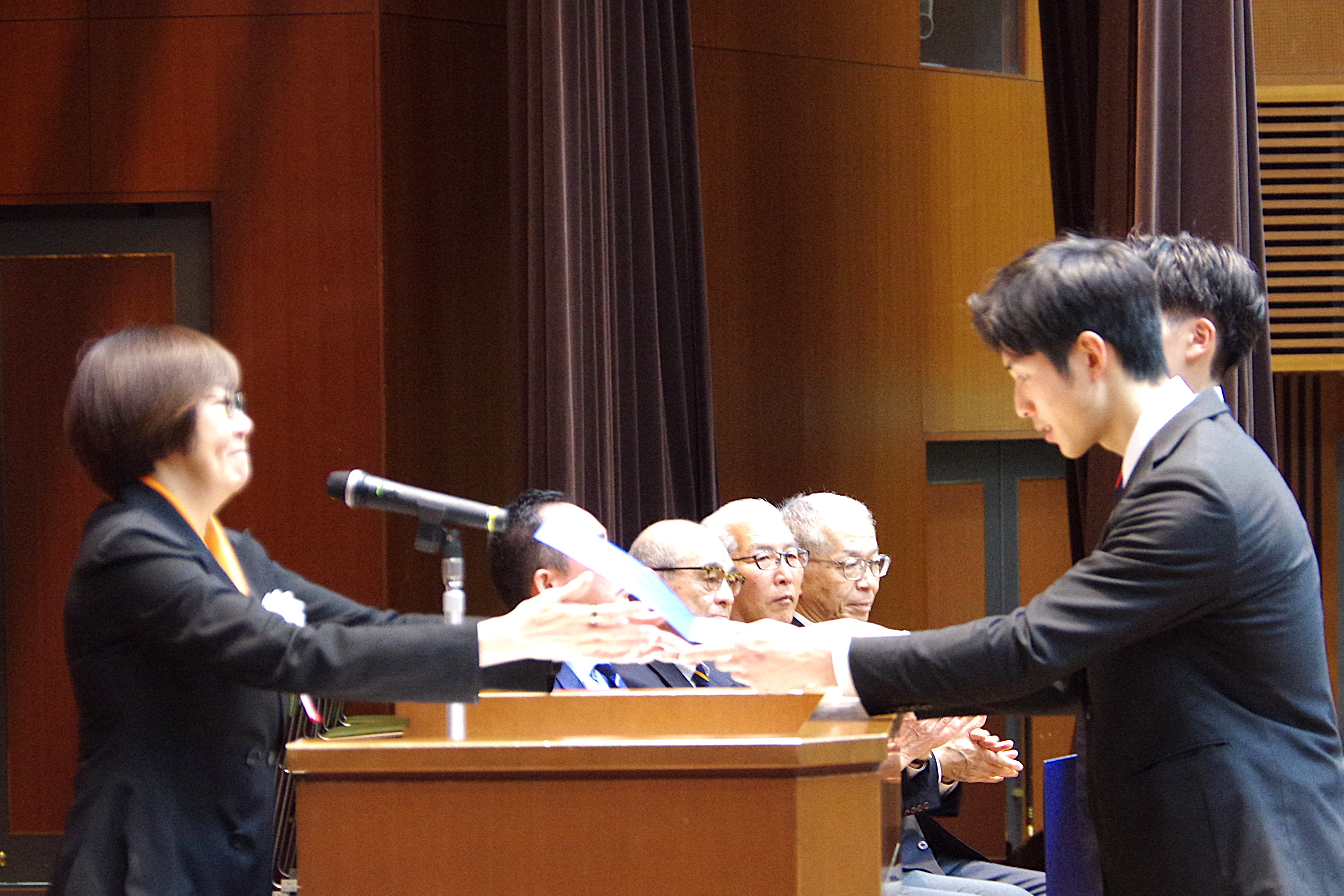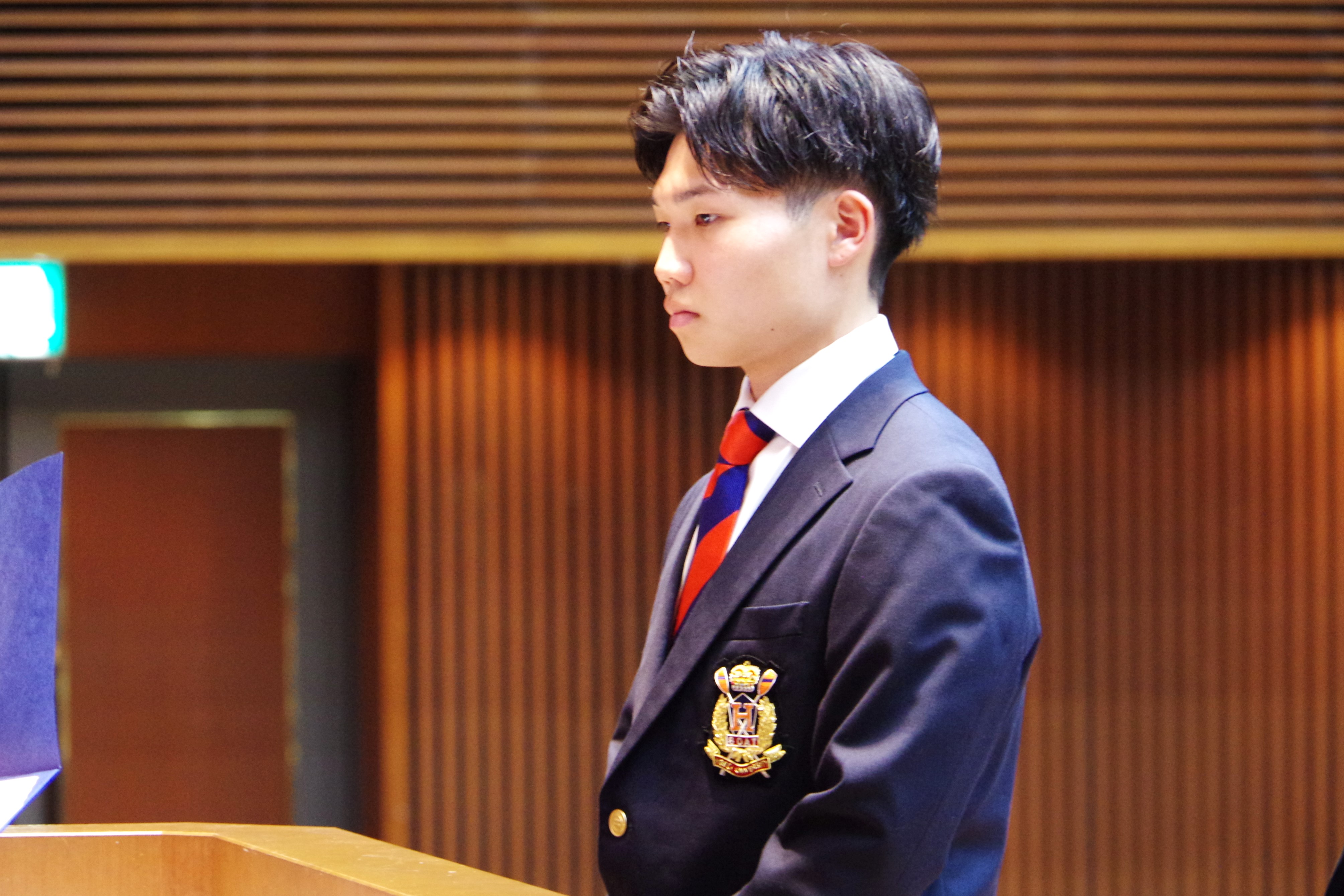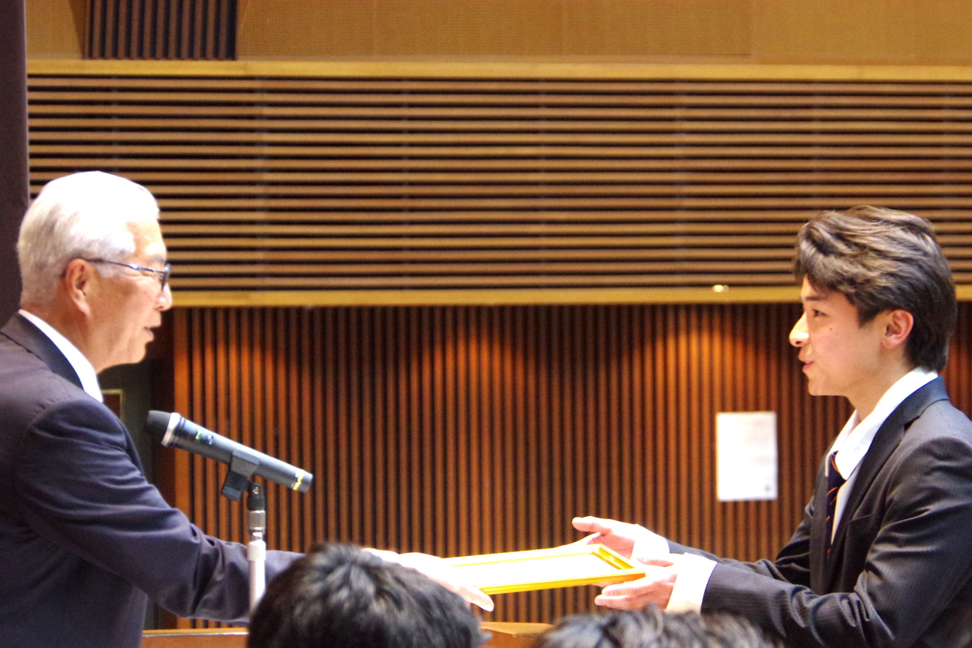 その後、大学表彰・法友体育会表彰の表彰式が執り行われ、卒業生を代表して、クライミングワールドカップ制覇を達成した山岳部の村下善乙さんからお礼の言葉が述べられました。