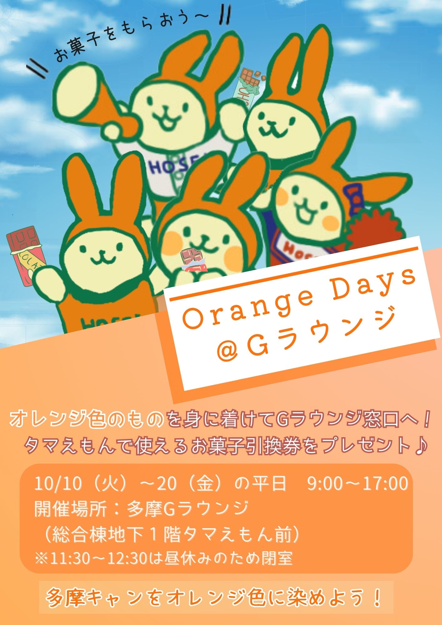 下記の期間中にオレンジ色のものを身に着けて多摩Gラウンジ窓口へお越しいただいた方へ、タマえもん(法政大学生協多摩店)で使えるお菓子引換券を窓口でプレゼントします!