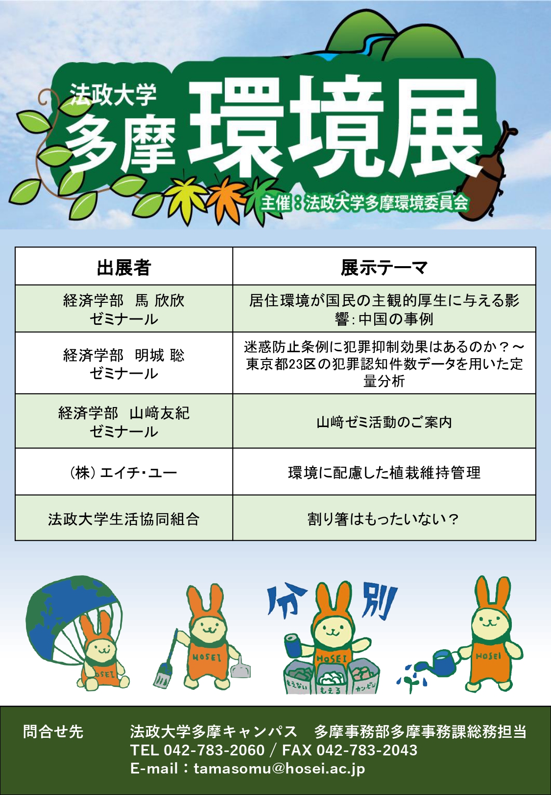 「多摩環境展」は、環境マネジメントプログラムの一つとして、教職員、学生および地域の皆様に環境について考える場を提供し、環境意識を高めることを趣旨として、毎年開催しています。