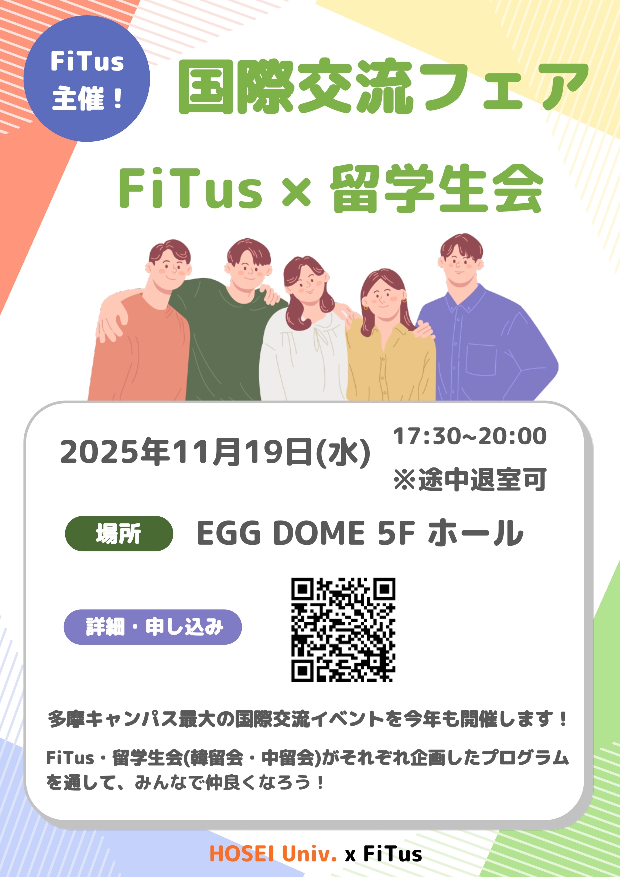 「多摩国際交流フェア」は、法政大学の留学生も含めたあらゆる学生が交流できる毎年恒例のイベントです。国際交流サークル「FiTus(フィッタス)」が考案したゲームや、中国・韓国の留学生会による企画を通じて、学生同士で交流を深めましょう!