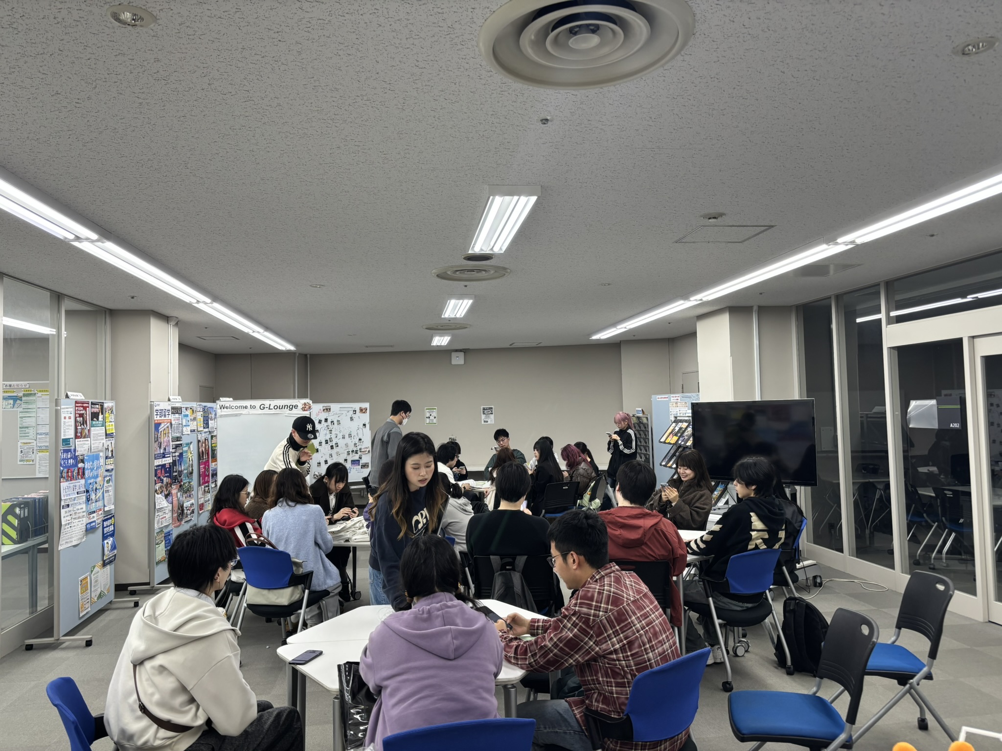 続いてGラウンジで履修相談会を行い、各学部の先輩の協力のもと、履修のポイントや注意点について説明しました。新入生からの質問も多く、活発なやり取りが印象的でした。