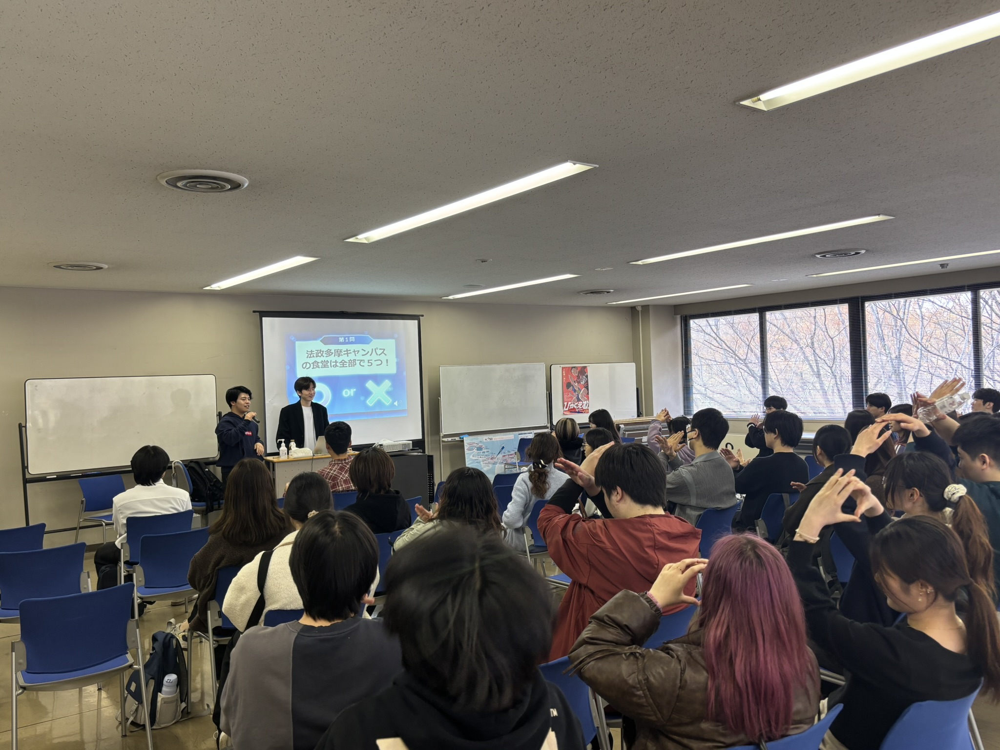 3月31日、新入生を対象としたガイダンスを実施しました。 午前中は、大学の制度や各留学生団体について紹介しました。新入生の皆さんがこれからの大学生活をイメージしやすいよう、分かりやすく伝えることを意識しました。 昼食時には、経済学部棟の食堂へ案内し、利用方法を説明しました。その後の交流会では、多摩キャンパスについて楽しく知ってもらうために〇×クイックイズを行い、会場はとても盛り上がりました。また、先輩たちが自分の学生生活について話すことで、新入生との距離も少しずつ縮まったように感じました。