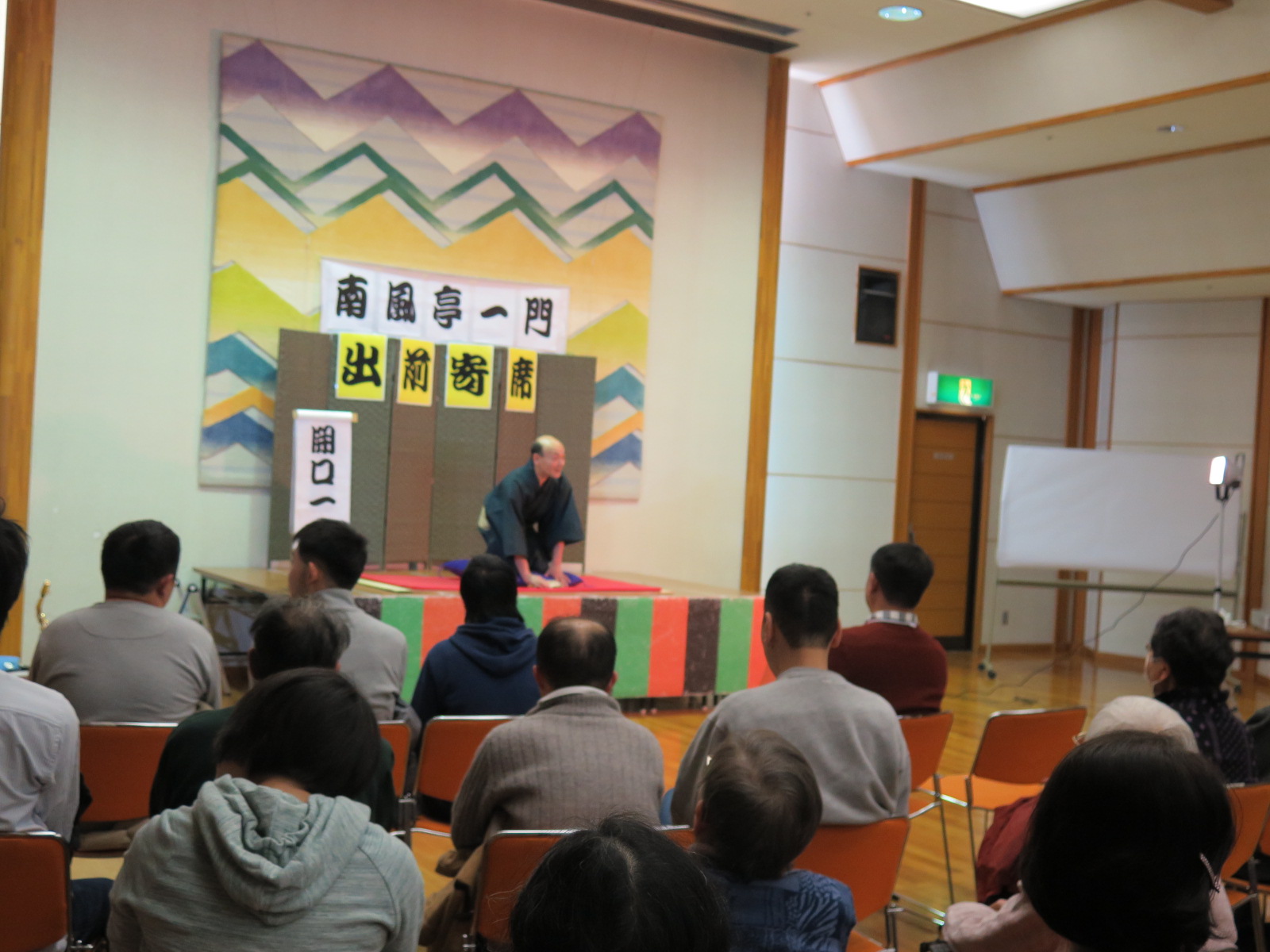 引き続き、学生たちは館内のホールに移動。落語会の南風亭一門さん3人が登場され、落語やマジック等を住民の方と楽しみました。舞台と参加者との軽妙なやり取りもおかしく、笑い声が絶えませんでした。