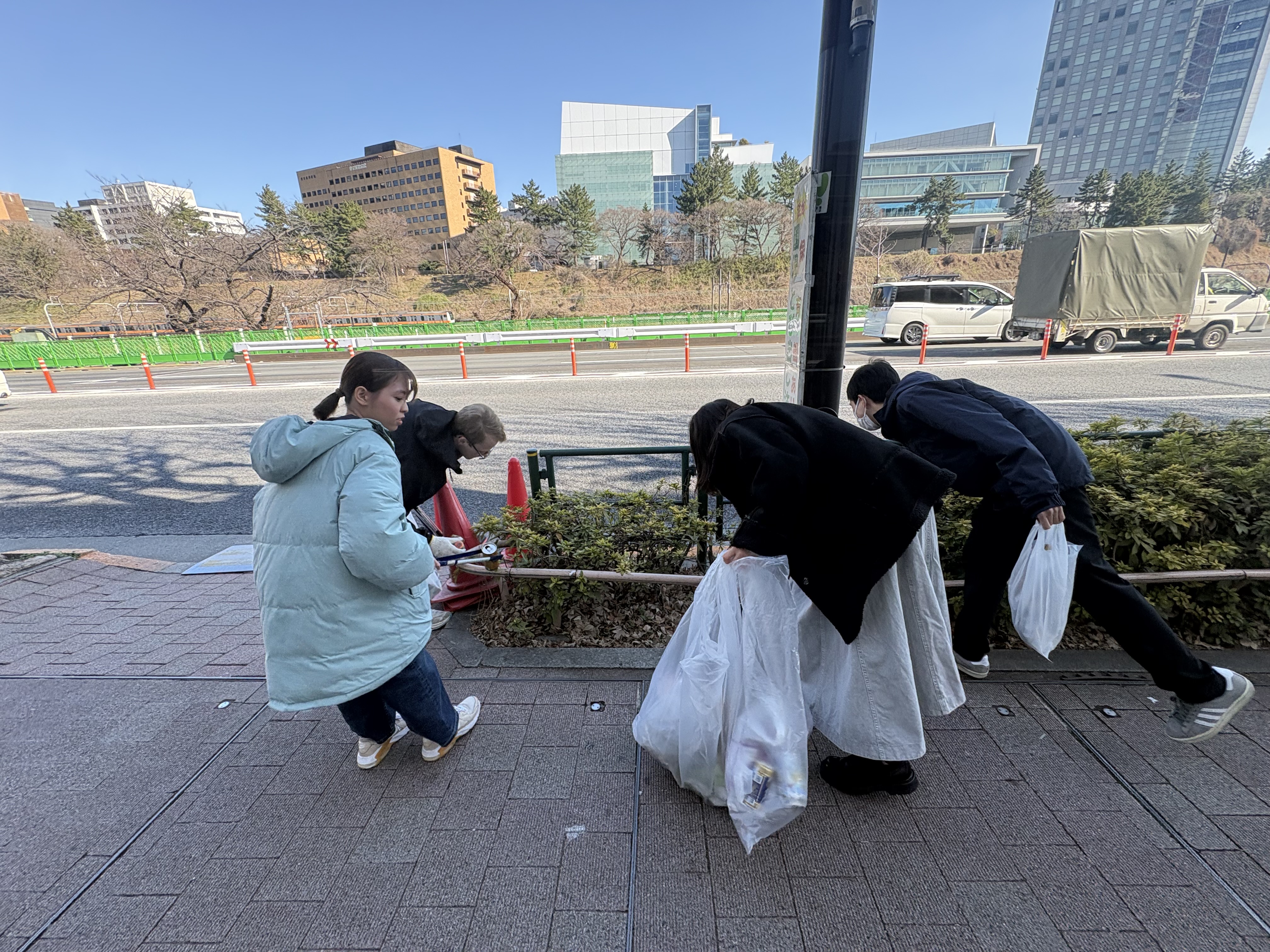 グループに分かれてキャンパス周辺のゴミを拾う
