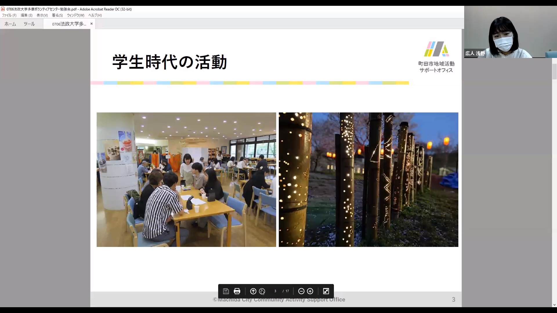 「ボランティア活動の先輩である橋本さんからご自身の経験談や活動に対する想いを詳しくお伺いする場はこれまで無かったため、大変貴重な機会になりました。これまで相原・町田地域と多様な繋がりを築かれてきた所以が、個人または団体として明確な目的や目標を持ち、異なる世代の意見を尊重し、異なる地域の活動を学ぶといった姿勢にあるように感じました。新しくボランティアセンターに所属してくれた学生を巻き込みながら、学生スタッフとしての主体的なボランティア活動を今後とも広げていきたいと思っています。特にまちカフェでは他団体さんとのコラボ企画を実現したいと考えているので、引き続きサポートいただけると幸いです…!大変貴重なご機会を頂き誠にありがとうございました。」(社会学部4年)