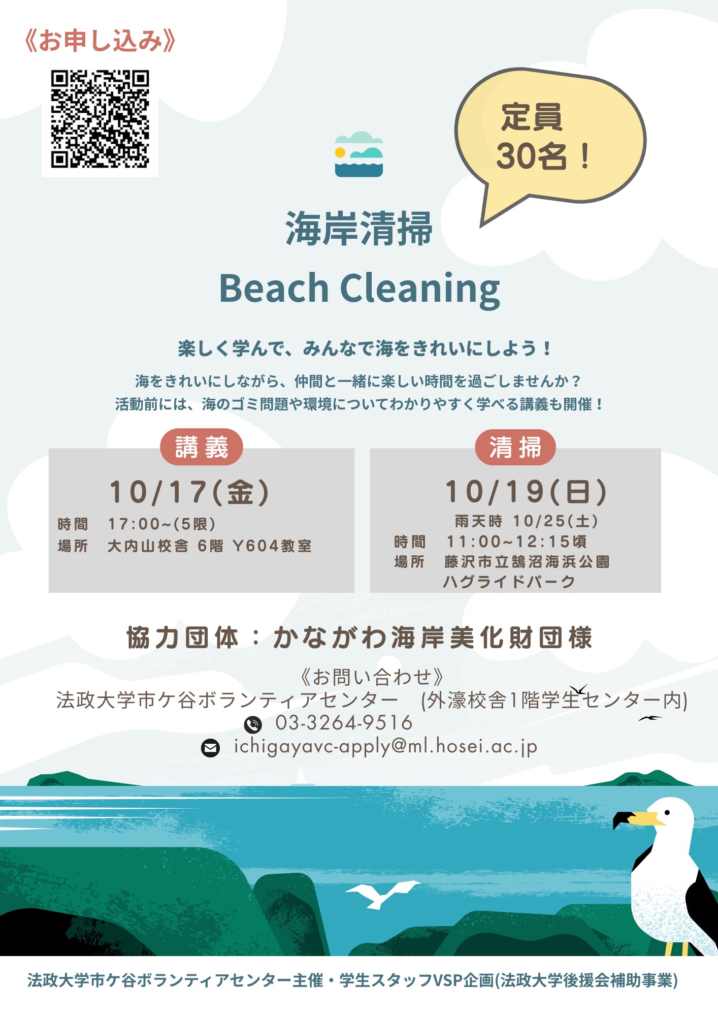 ※Googleフォームで申し込めない場合は、メールでの申し込み (ichigayavc-apply@ml.hosei.ac.jp)まで件名「海岸清掃企画参加希望」とし、「氏名」「学部・学科」「学生証番号」「メールアドレス」「電話番号」をお知らせください。