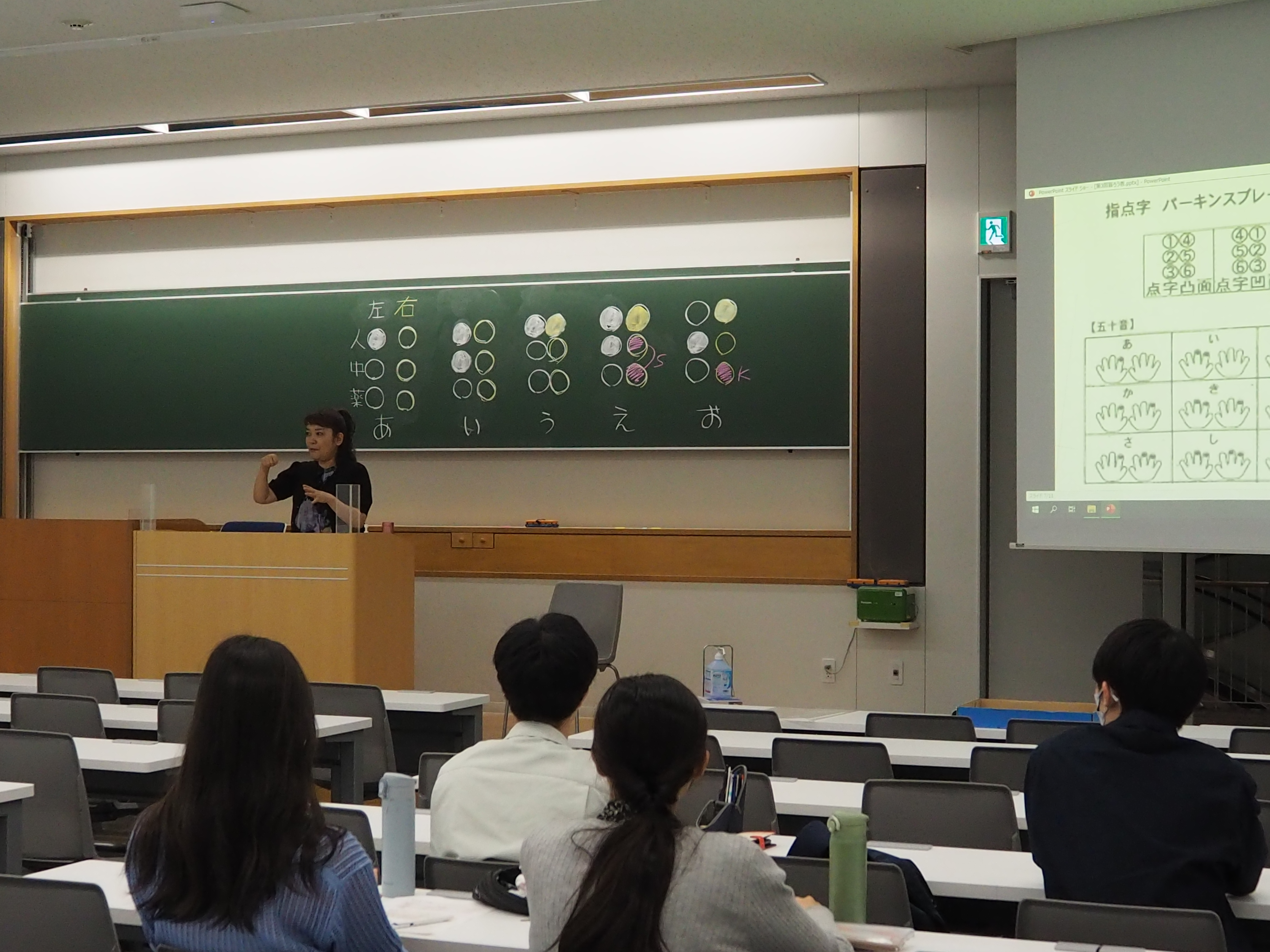 またひとつ知見が広がり、より多くの人とコミュニケーションが取れるような気がしました。講義内で紹介されていたヘレンケラーの言葉「愛の対極にあるのは憎しみではなく無知」が印象的でした。知らないと気にすることもなく、そして助けを必要とする人々の思いや考えを自分なりに考えるだけに終わってしまうように思います。まずは『知ること』を大切にしたいです。指文字、点字、手話を知った時、沢山の人と意思疎通がとれるとわくわくしました。そのために、上記の事柄について勉強します。有意義な時間をありがとうございました。(法学部法律学科1年 根岸 祐里)