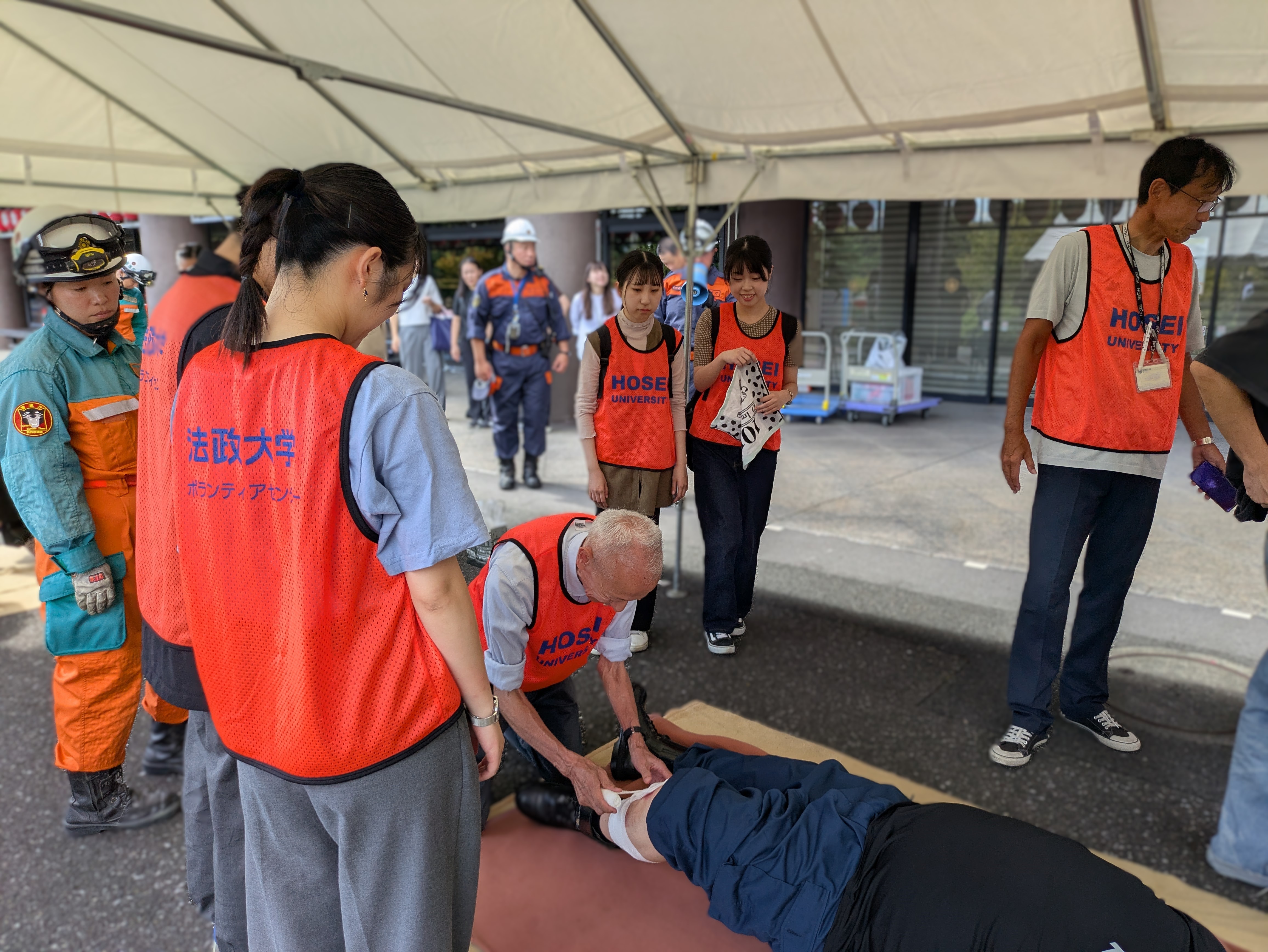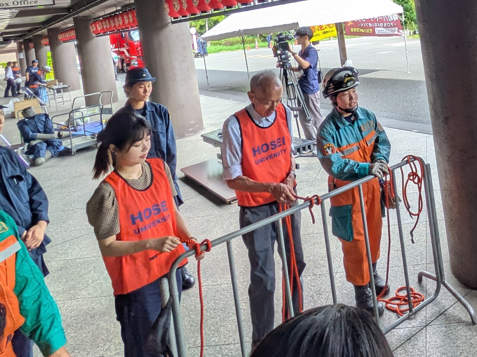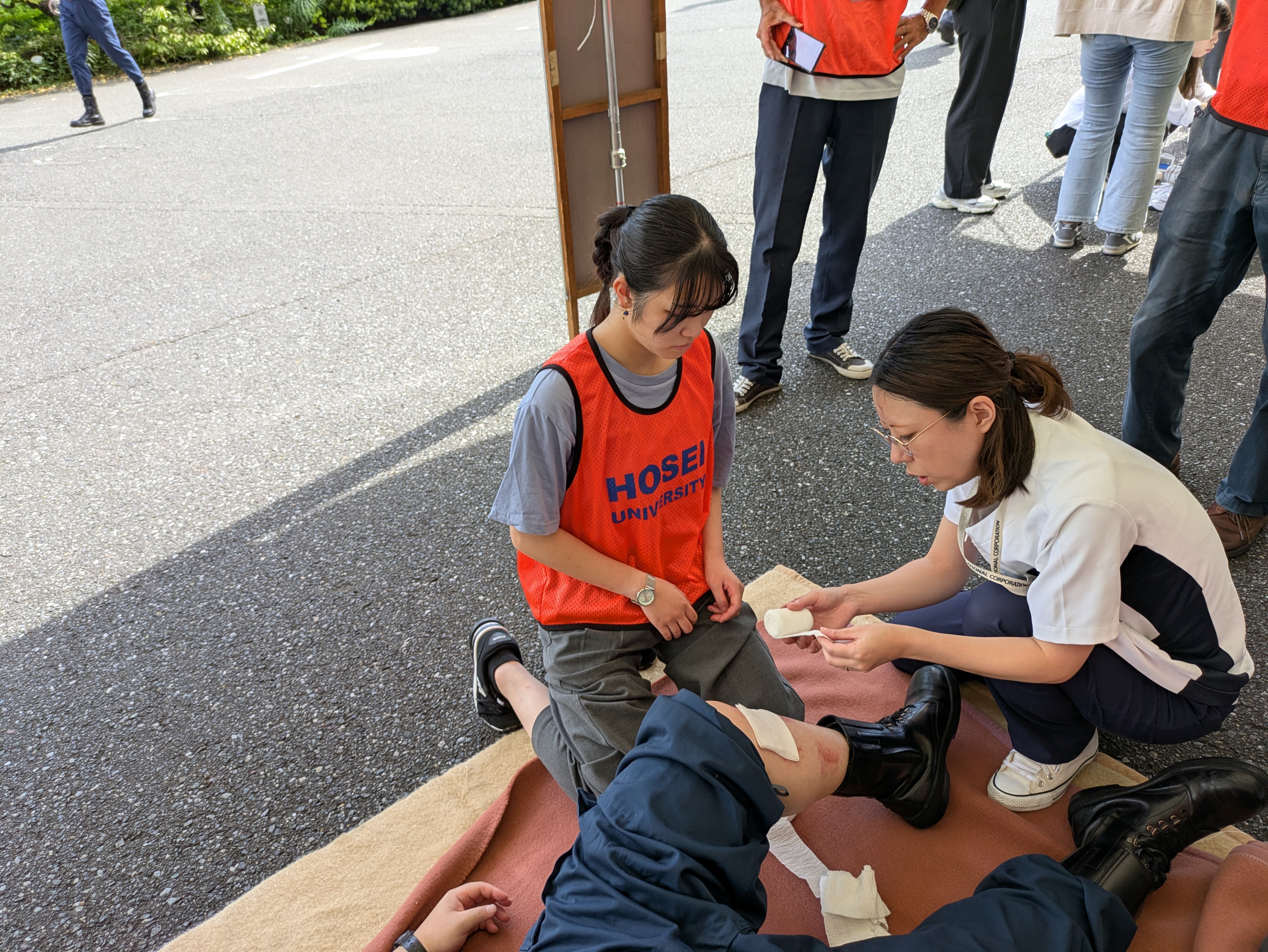 2025年10月6日に国立劇場前庭にて、2025年度麹町災害対策総合訓練が開催された。法政大学の学生5人が参加した。災害が起きた時の応急手当や、搬送法など実践に近いものの他、地震VR車体験や、消火体験などさまざまなことに取り組んだ。また、もやい結び、巻結びというロープ結び訓練やそれを応用した災害競技会が開催された。最後に、備蓄食料の試食会を行い、普段のローリングの習慣に活かしたいと考える機会になった。災害が発生する前から知識の備えと実践の経験の大切さを学ぶイベントであった。(ボランティアセンター学生スタッフチーム・オレンジ 文学部地理学科3年 渡邊 映乃)