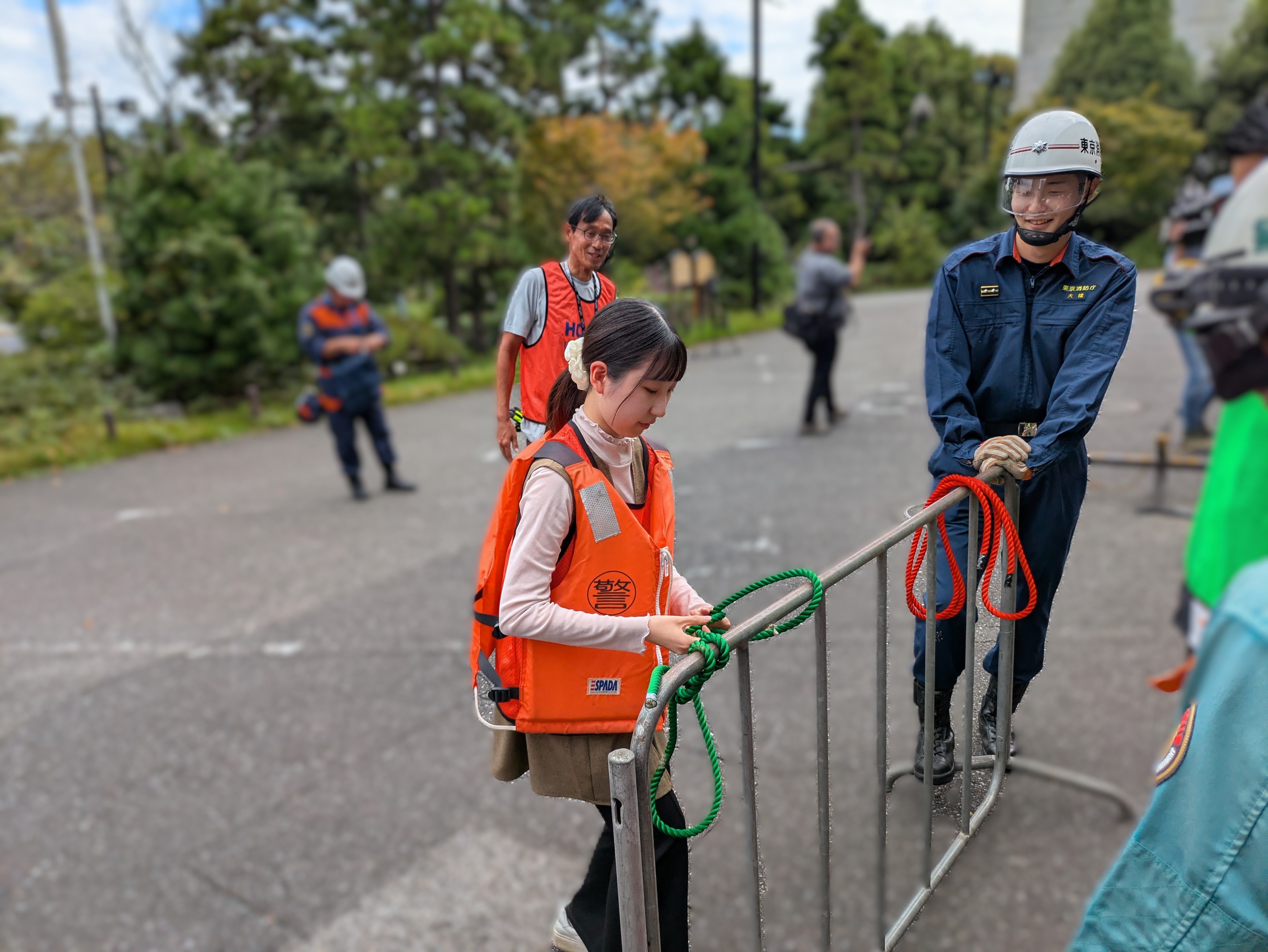 防災訓練に参加し、災害発生時の行動や応急対応について実践的に学ぶとても良い機会となりました。VRによる震度7の地震体験では、想像を超える揺れの強さに恐怖を覚えると同時に、冷静な判断を保つことの難しさを実感しました。また、もやい結びなどのロープの結び方を学び、救助や搬送に必要な基本技術を身につけました。さらに、大量出血時の止血法を体験し、身近な布一枚でも応急処置に役立てることができるということを学び、このような知識を身につけておくことが、災害時に人を助けることにもつながると感じました。訓練全体を通して、防災への意識がより一層高まり、日頃から備えておくことの重要性を実感しました。今回の学びを忘れず、災害発生時には落ち着いて行動できるよう努めていきたいと思います。(法政大学法学部法律学科4年 青景 紗羅)