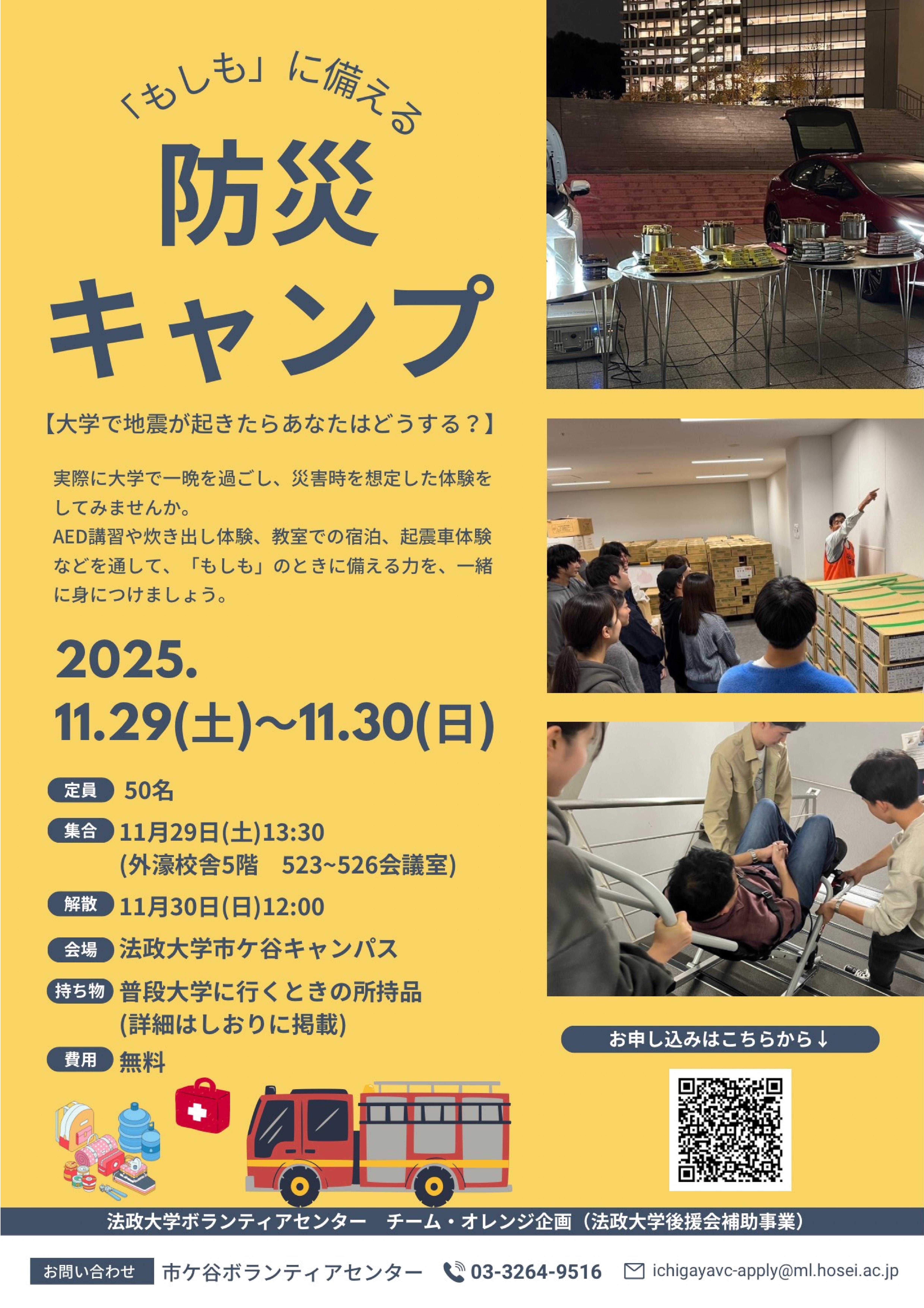 ※Googleフォームで申し込めない場合は、メールでの申し込み (ichigayavc-apply@ml.hosei.ac.jp)まで件名「防災キャンプ申込希望」とし、