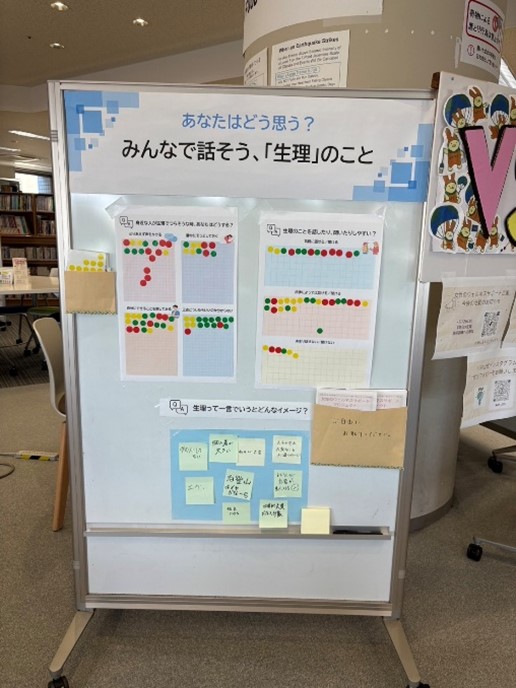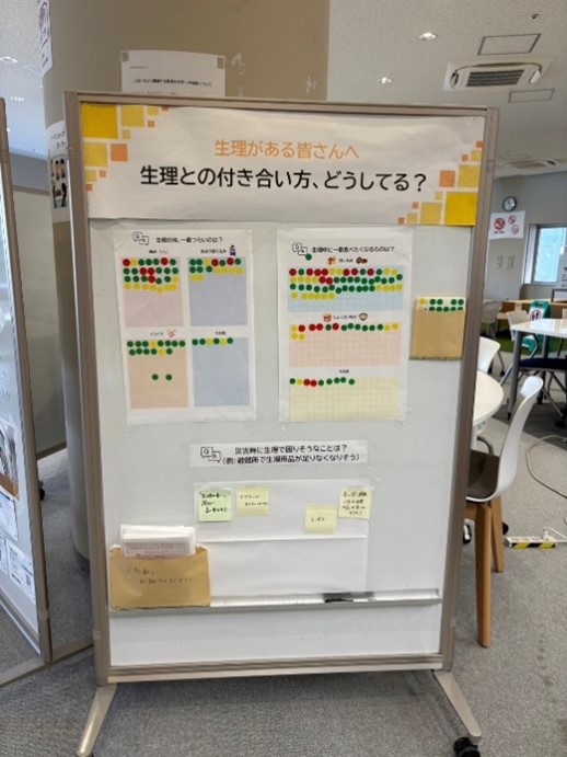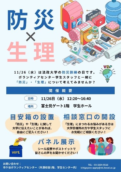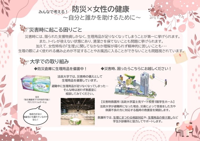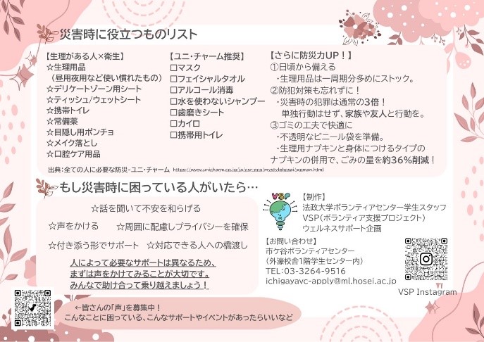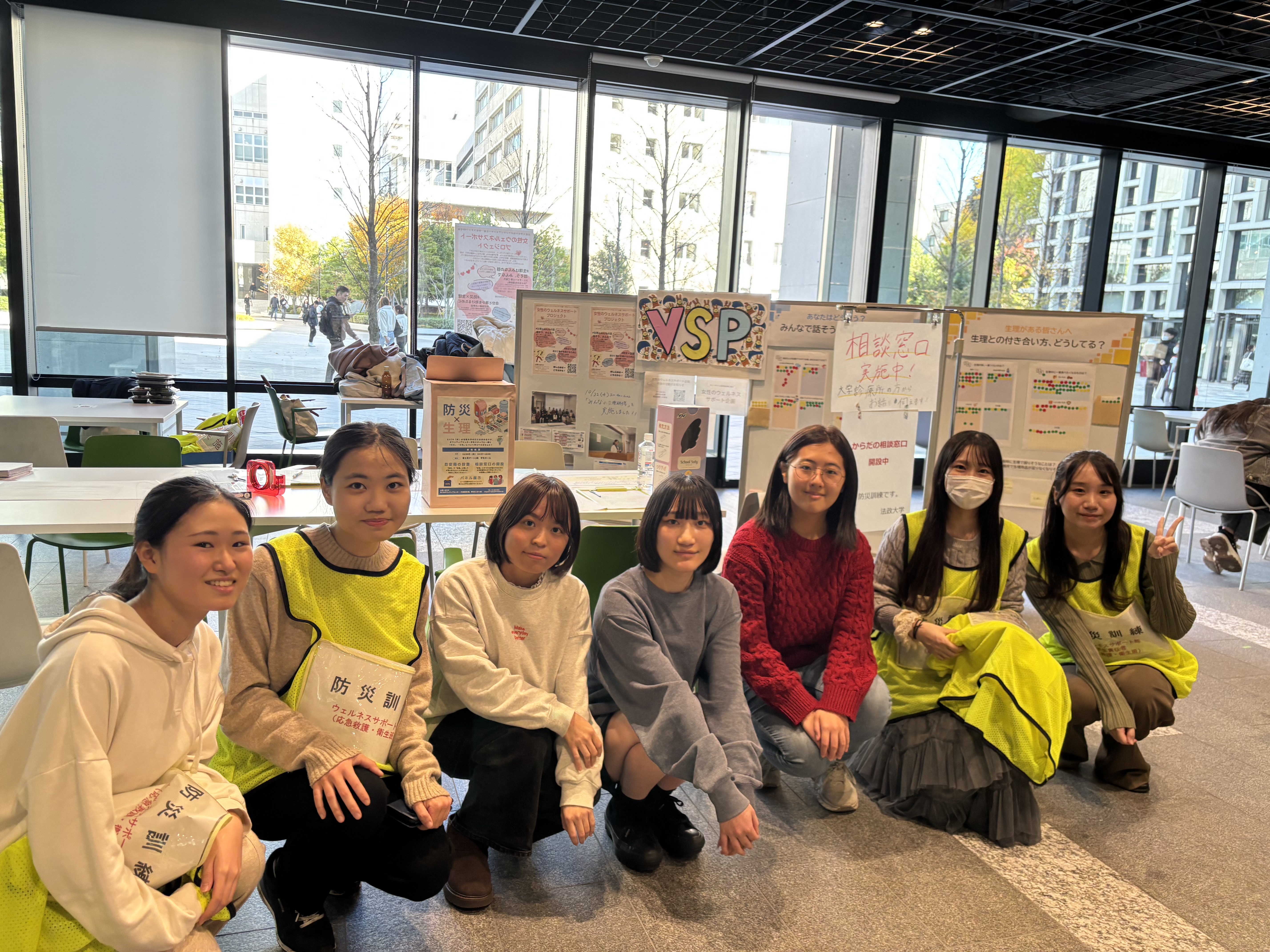 ユニ・チャーム(株)様ご協力のもと、生理に関する知識を広め、人々の生理についての理解を得ていくため、「生理研修」を実施しました。本企画では性別に関係なく、生理について広めていきたいと考えており、チラシ配布の際には男女平等にいきわたるように気を配りました。また、生理研修ではユニ・チャーム(株)様による「生理研修」の実施の時点で販売されている豊富な種類の生理用品の解説や生理によって心身に起きる影響を学び、生理についての知識や生理中の女性への理解を促しました。また、男性の参加者による質問では、生理中の女性にどのような対応をとるべきなのかといった積極的な姿勢が見受けられました。女性の方も当事者意識をもって考える機会を提供することで、能動的な姿勢を持つきっかけを提供できたと感じています。「防災訓練」では、企画者が本企画の意図とする防災と女性の健康について作成したチラシを配布し、学生に生理用品が保管されていること、災害時の生理用品の配布場所を周知するための活動をしました。加えて、生理に関する相談に対応するため、学生ホールに相談所を設置しました。今回実施した「生理研修」や「防災訓練」は、十分周知されていない生理に関する知識を学ぶきっかけになり、人々の生理への理解がさらに一歩深まるような企画だったと感じています。VSP企画者として今後もこういった活動を継続して行っていきたいです。(ボランティアセンター学生スタッフVSP 国際文化学部国際文化学科1年 飯塚 智咲)