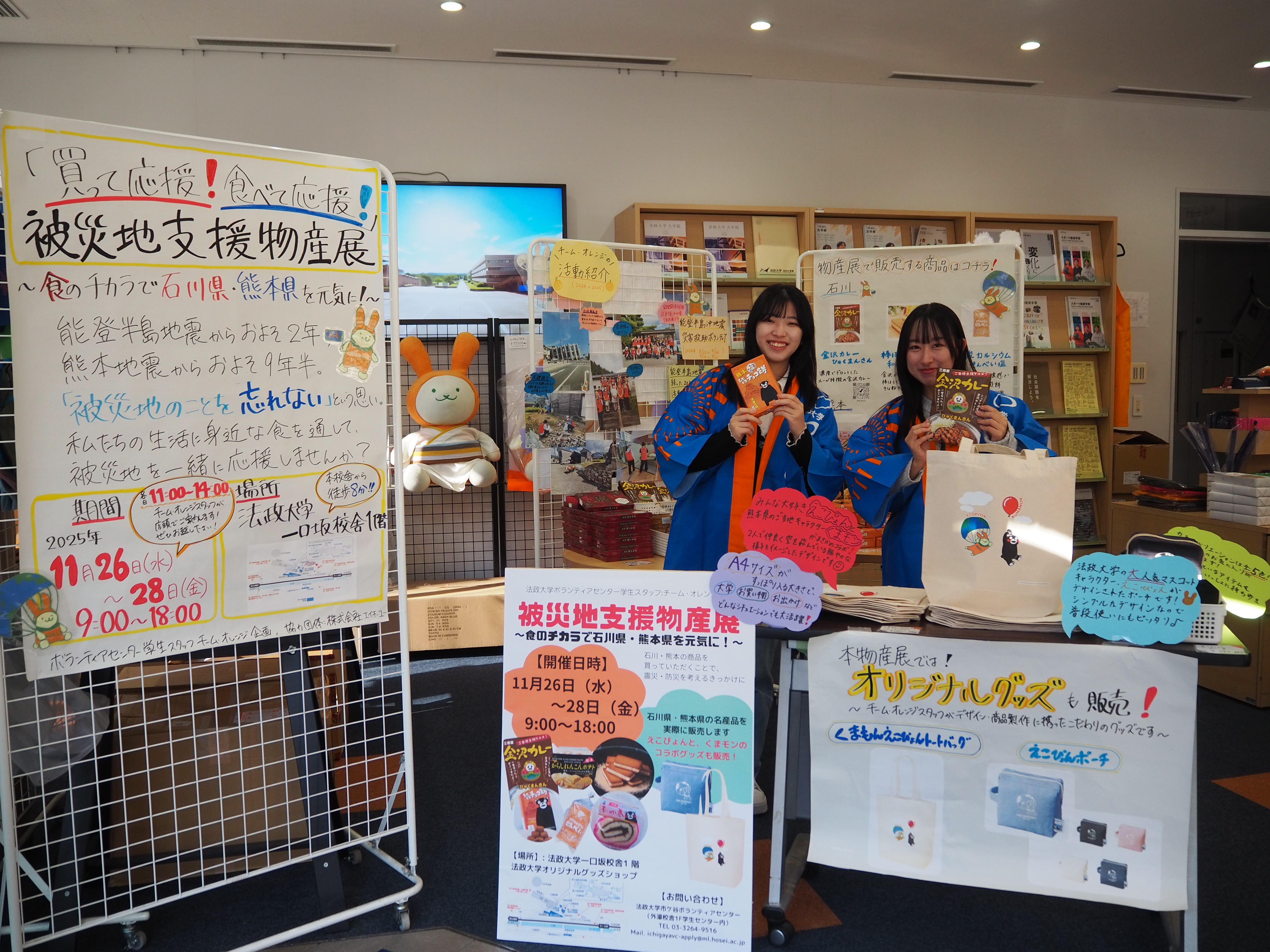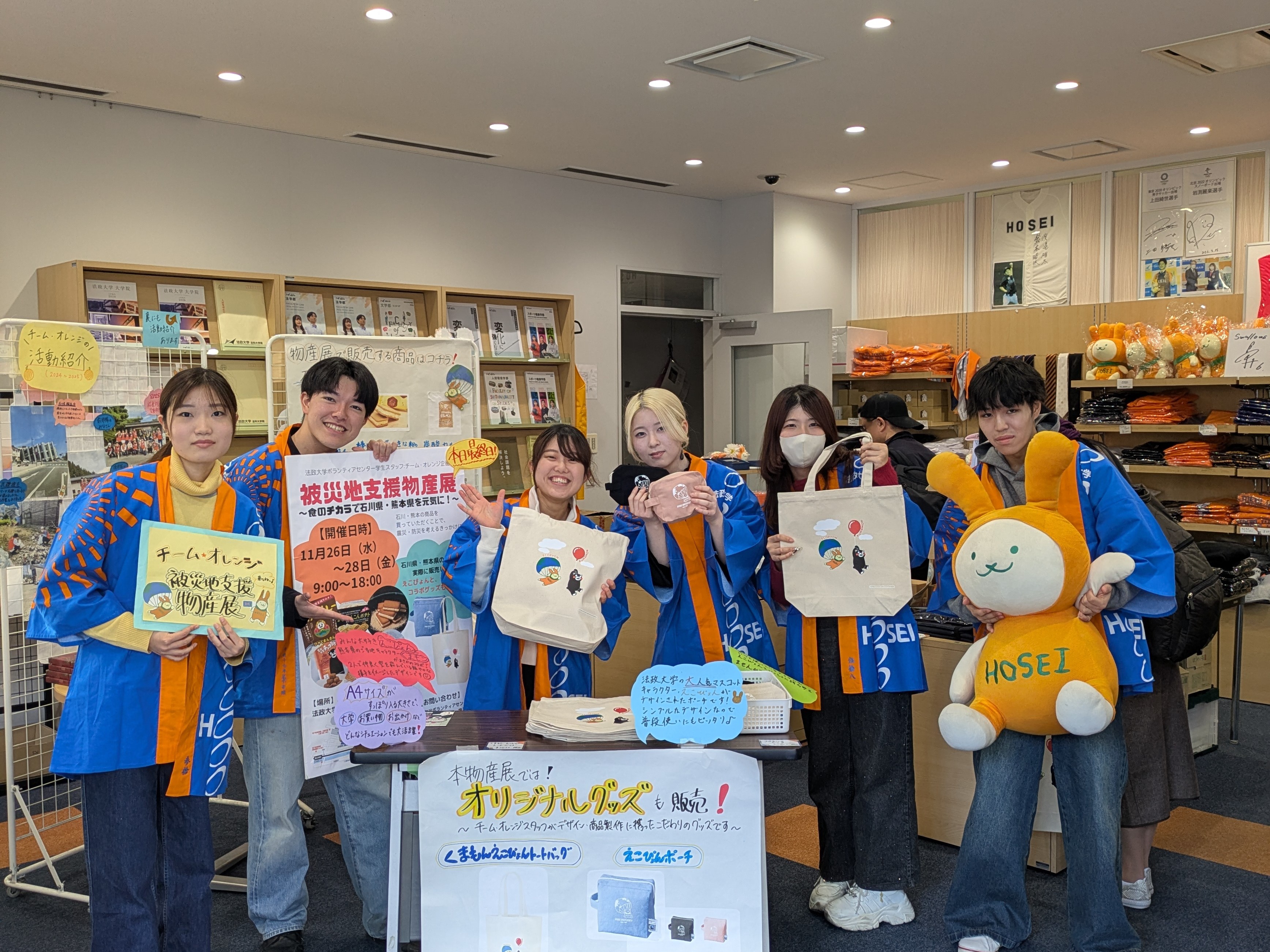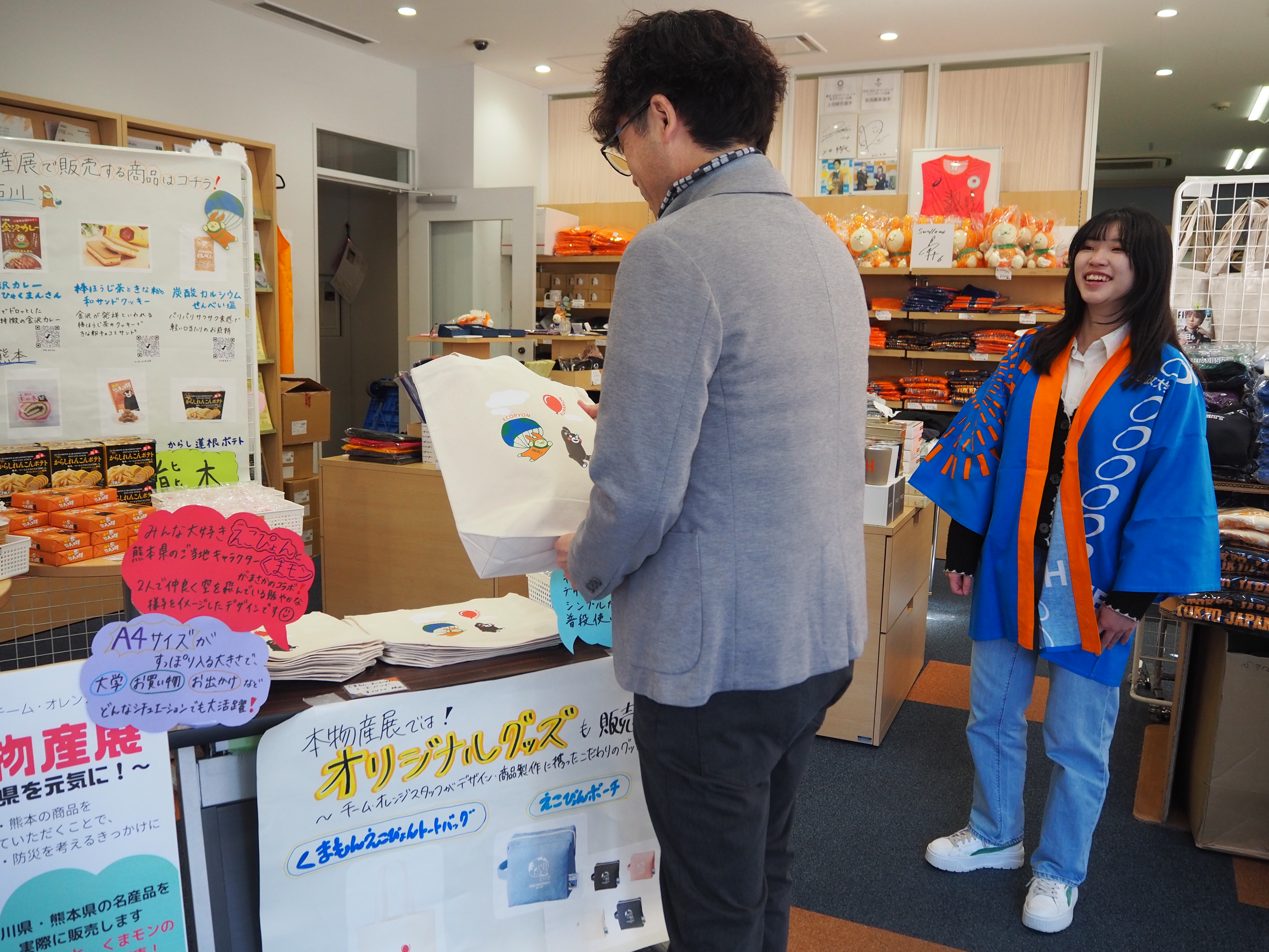 甚大な被害を及ぼした能登半島地震から1年半、熊本地震から9年の歳月が経過し、今もなお、避難所での生活を強いられている方々がいたり、復旧・復興していない施設やインフラが残ったりしています。しかし一方で、震災の影響を受けていない人々の震災に関する記憶や関心が薄れつつあると思われます。「被災地やそこに暮らす方々のことを忘れないでほしい」、「少しでも被災地の力になりたい」。そんな思いから、被災地の特産品を学内で販売する「被災地支援物産展」を開催しました。今回の物産展では石川県や熊本県の名産を楽しむことができる食品に加え、本学マスコットキャラクターえこぴょんと熊本県PRマスコットキャラクターくまモンのコラボデザイントートバッグや、えこぴょんがデザインされたポーチも販売しました。当日はチーム・オレンジ所属の学生による店頭での呼び込みや、チーム・オレンジの過去の活動に関する展示を実施しました。3日間を通して本学関係者だけでなく一般の方々にもご来店いただいたことで、チーム・オレンジの活動や被災地について多くの方々に知っていただくことができました。今回の物産展で得た売上金の一部は、能登半島地震および熊本地震の寄付金として活用する予定です。