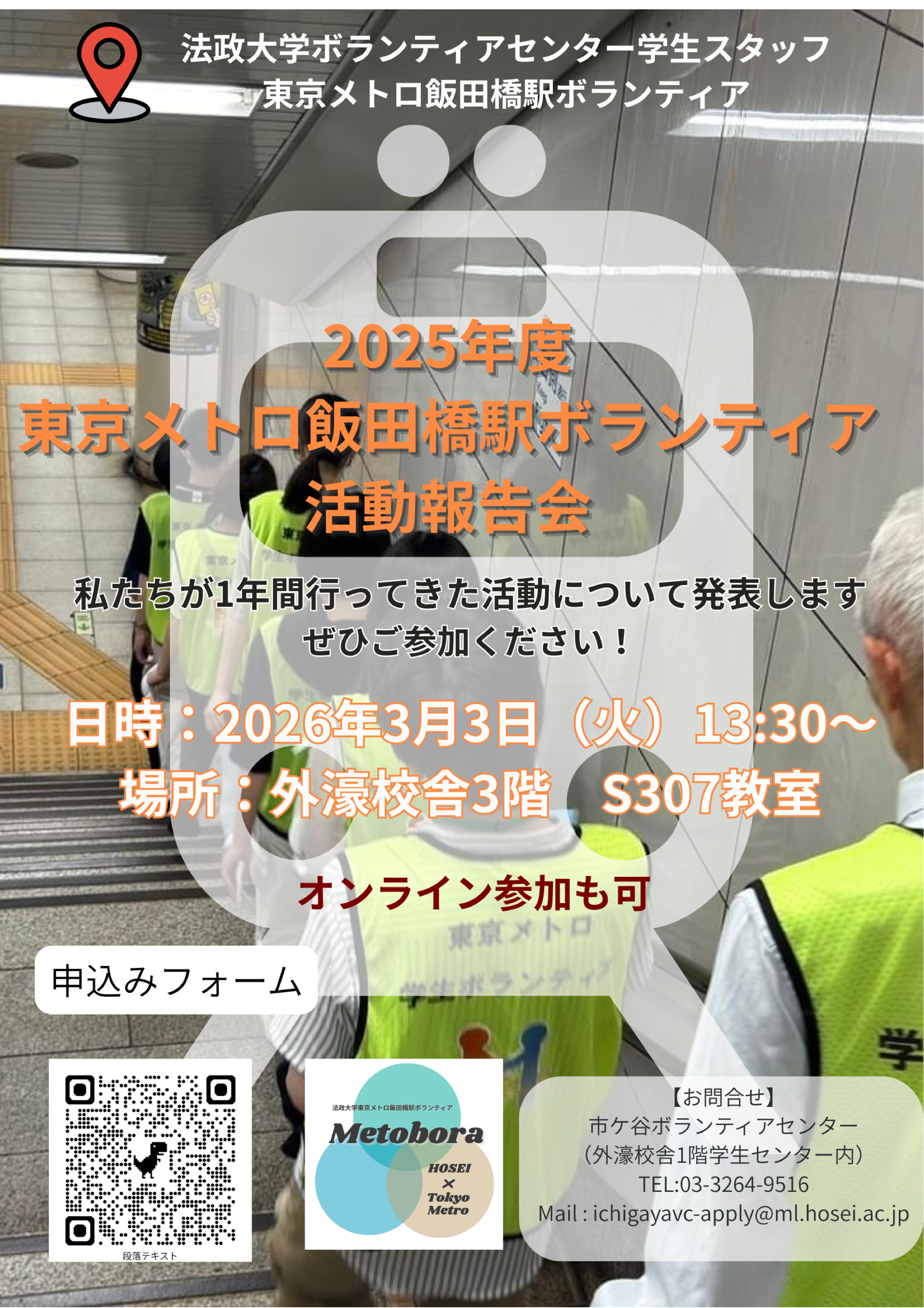 ※Googleフォームから申し込めない方は、氏名、学生証番号、学部学科学年、メールアドレス、件名「2025年度東京メトロ飯田橋駅ボランティア活動報告会参加希望」とし、こちらのメール(ichigayavc-apply@ml.hosei.ac.jp)にお申込ください。