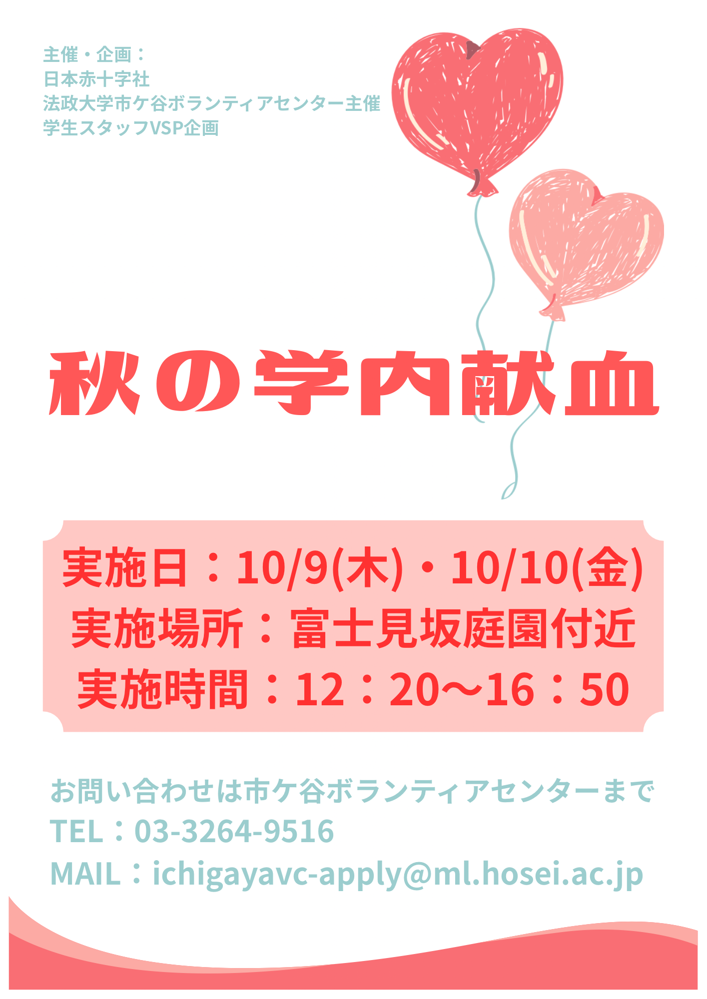 【市ケ谷】秋の献血へのご協力をお願いします!(10/9・10/10)