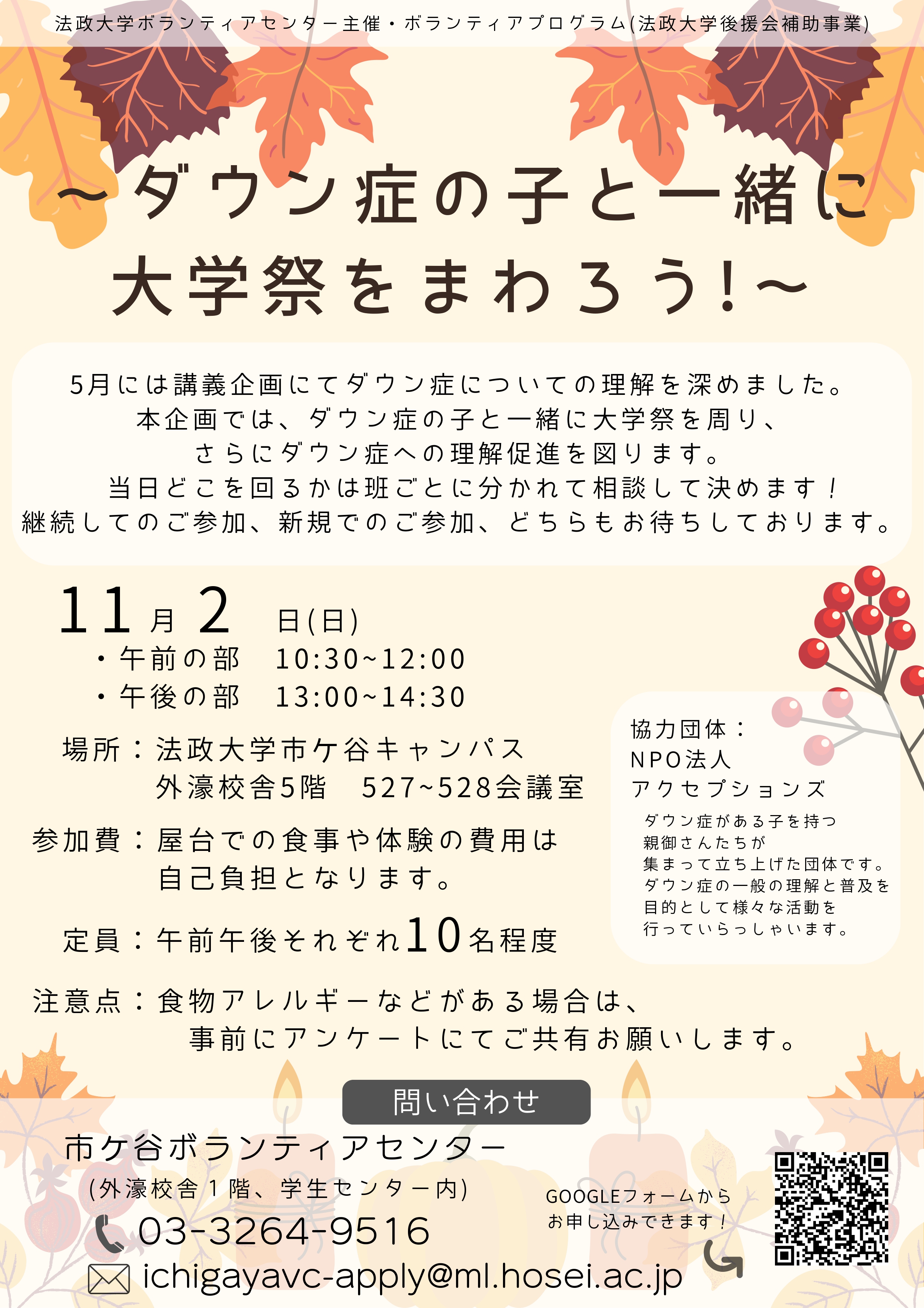 ※Googleフォームで申し込めない場合は、メールでの申し込み (ichigayavc-apply@ml.hosei.ac.jp)まで件名「ダウン症の子と大学祭をまわろう企画参加希望」とし、「氏名」「学部・学科・学年」「学生証番号」「メールアドレス」「電話番号」「希望時間帯」をお知らせください。
