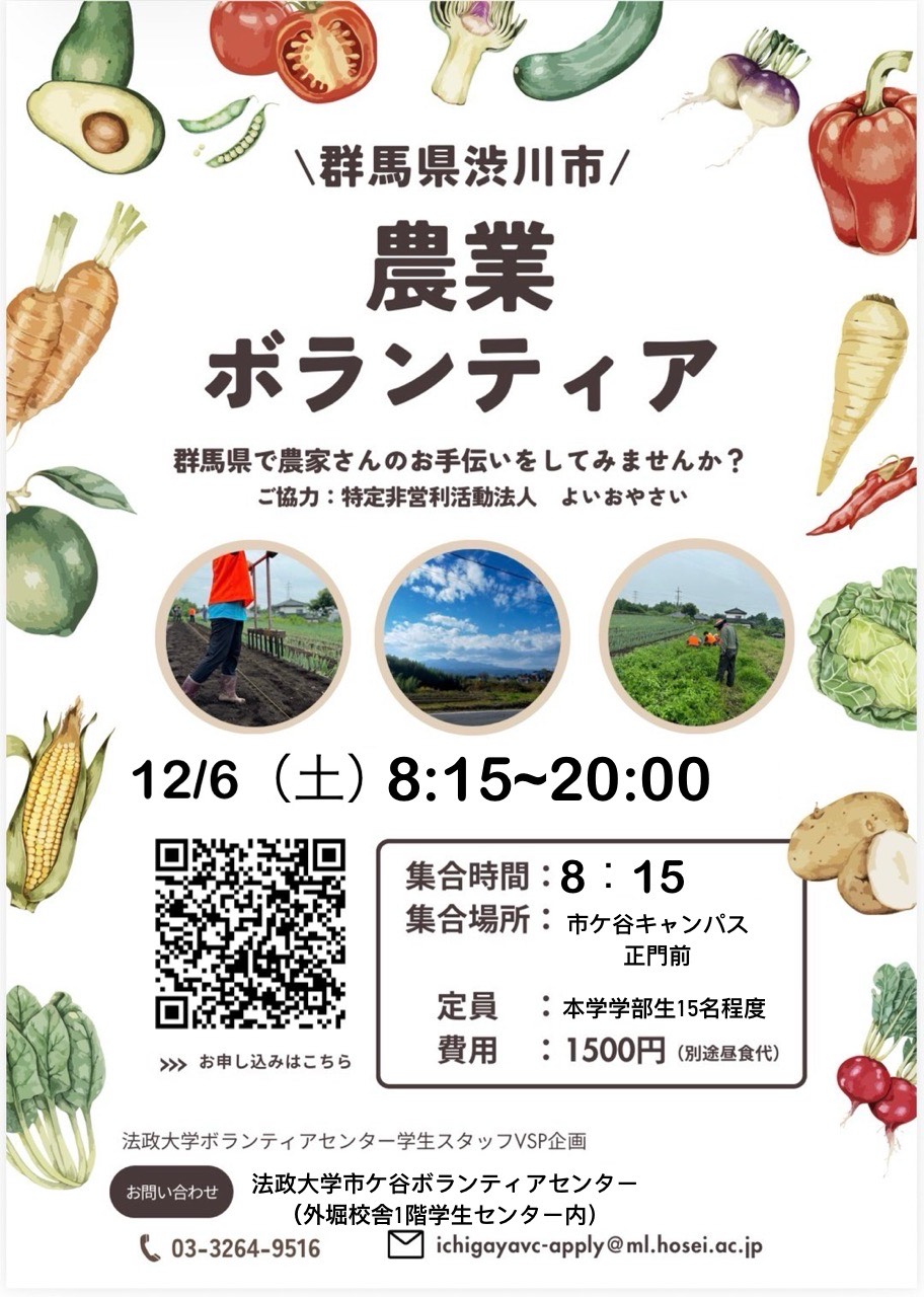※Googleフォームで申し込めない場合は、メールでの申し込み (ichigayavc-apply@ml.hosei.ac.jp)まで件名「農業企画参加希望」とし、「氏名」「学部・学科・学年」「学生証番号」「メールアドレス」「電話番号」をお知らせください。