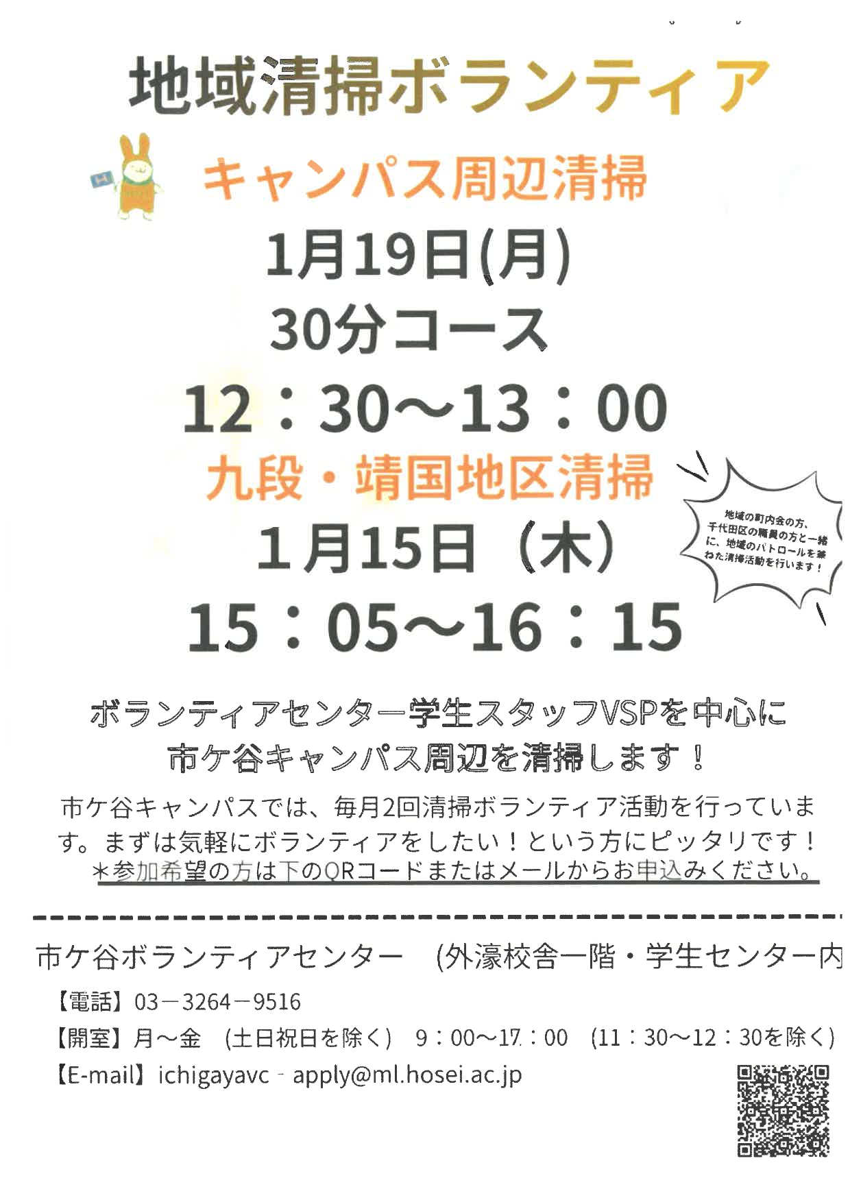 ※Googleフォームから申し込めない方は、氏名、学生証番号、学部学科学年、メールアドレス、どちらの清掃に参加希望かを明記の上、こちらのメール(ichigayavc-apply@ml.hosei.ac.jp)にお申込ください。